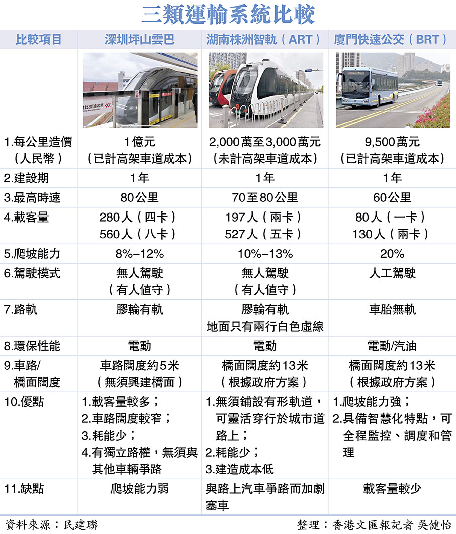 民建聯九龍東立法會議員顏汶羽表示,早前到內地多個城市考察後,發現不同的捷運模式都各有好處和局限。例如深圳坪山雲巴、湖南株洲智軌等均使用電池行駛,成本效益上符合香港特區政府的要求,雲巴最多可設8卡 ,共載560人;智軌優勢是使用膠輪無軌,無需設置高架車道便可以運行;而快速公交的優點是爬坡能力強,能在香港半山地區運行。