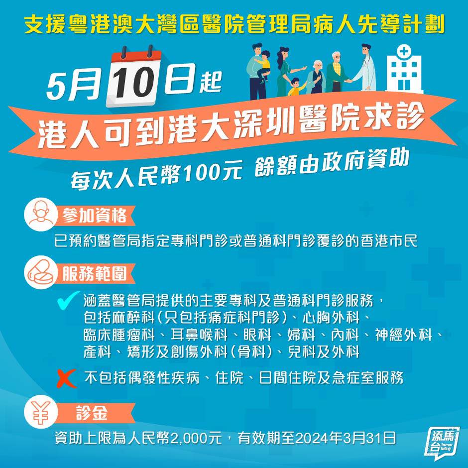 大公文匯全媒體報道,特區政府公布,今日(10日)推出支援粵港澳大灣區醫院管理局病人先導計劃,合資格香港市民可於香港大學深圳醫院接受資助診症服務,診金每次100元人民幣,餘下費用差額由先導計劃資助,上限2000元人民幣,有關資助上限的有效期至明年3月31日。