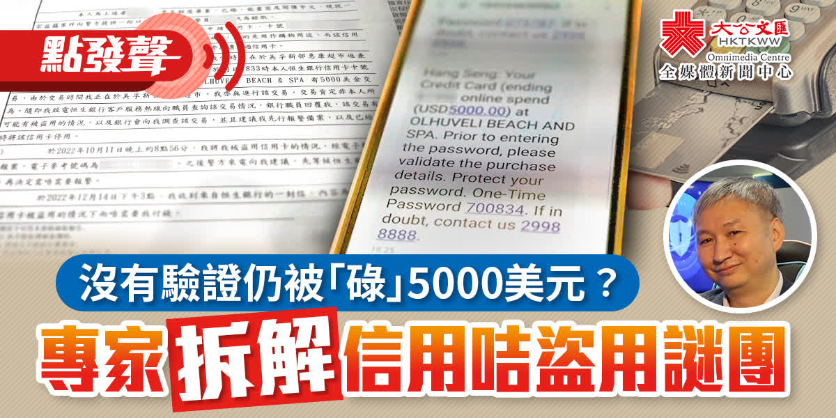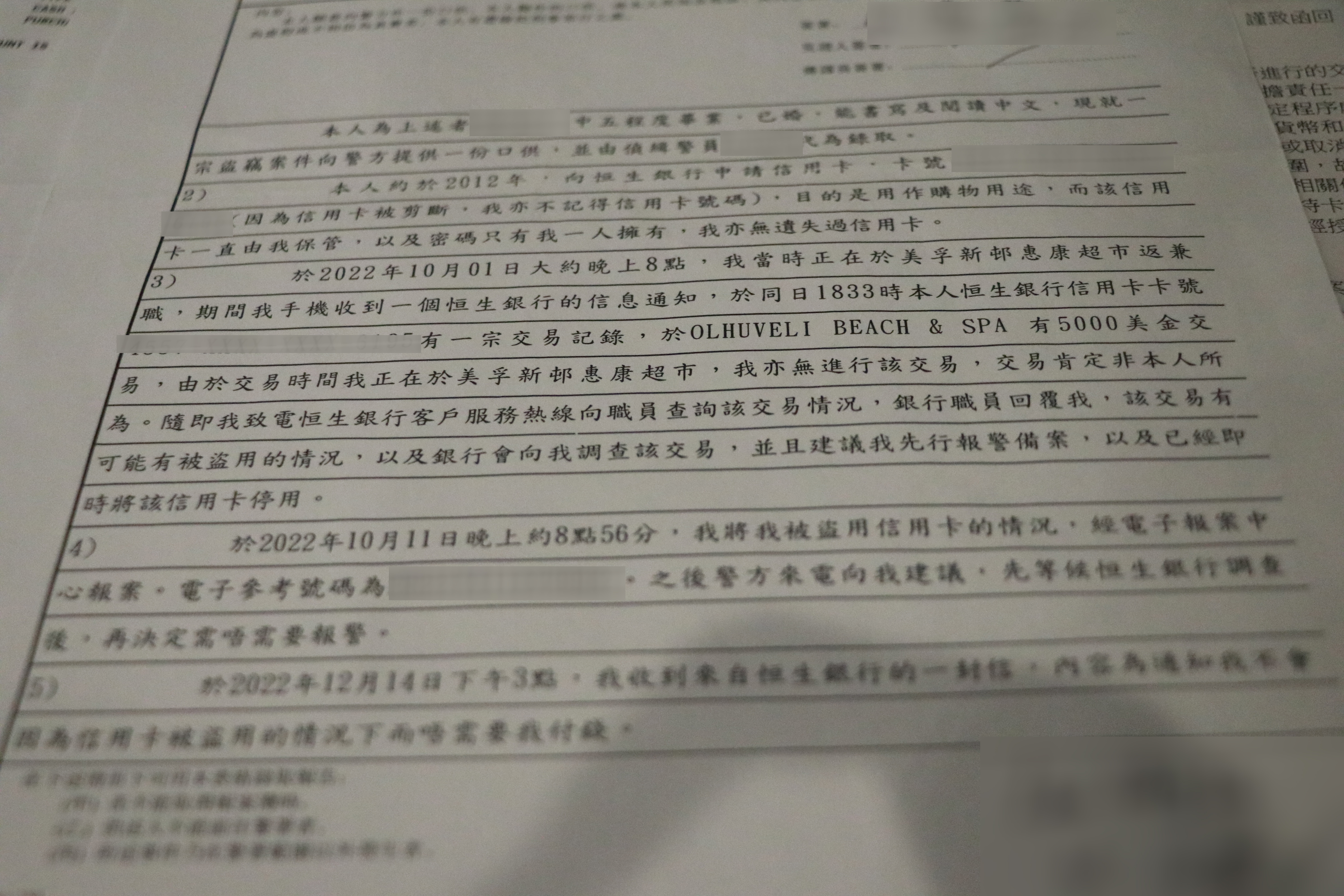 點新聞讀者劉小姐早前投訴,恒生銀行去年10月未經其同意,完成一宗與OLHUVELI BEACH & SPA相關的5000美元(約39000港元)信用卡交易。劉小姐指,自己當時正身處美孚新邨惠康超級市場,其間未有輸入銀行提供的一次性手機短訊驗證碼(SMS OTP),懷疑個人資料遭盜用,已即時致電銀行停用該信用卡,而她其後亦通過警方電子系統報案。