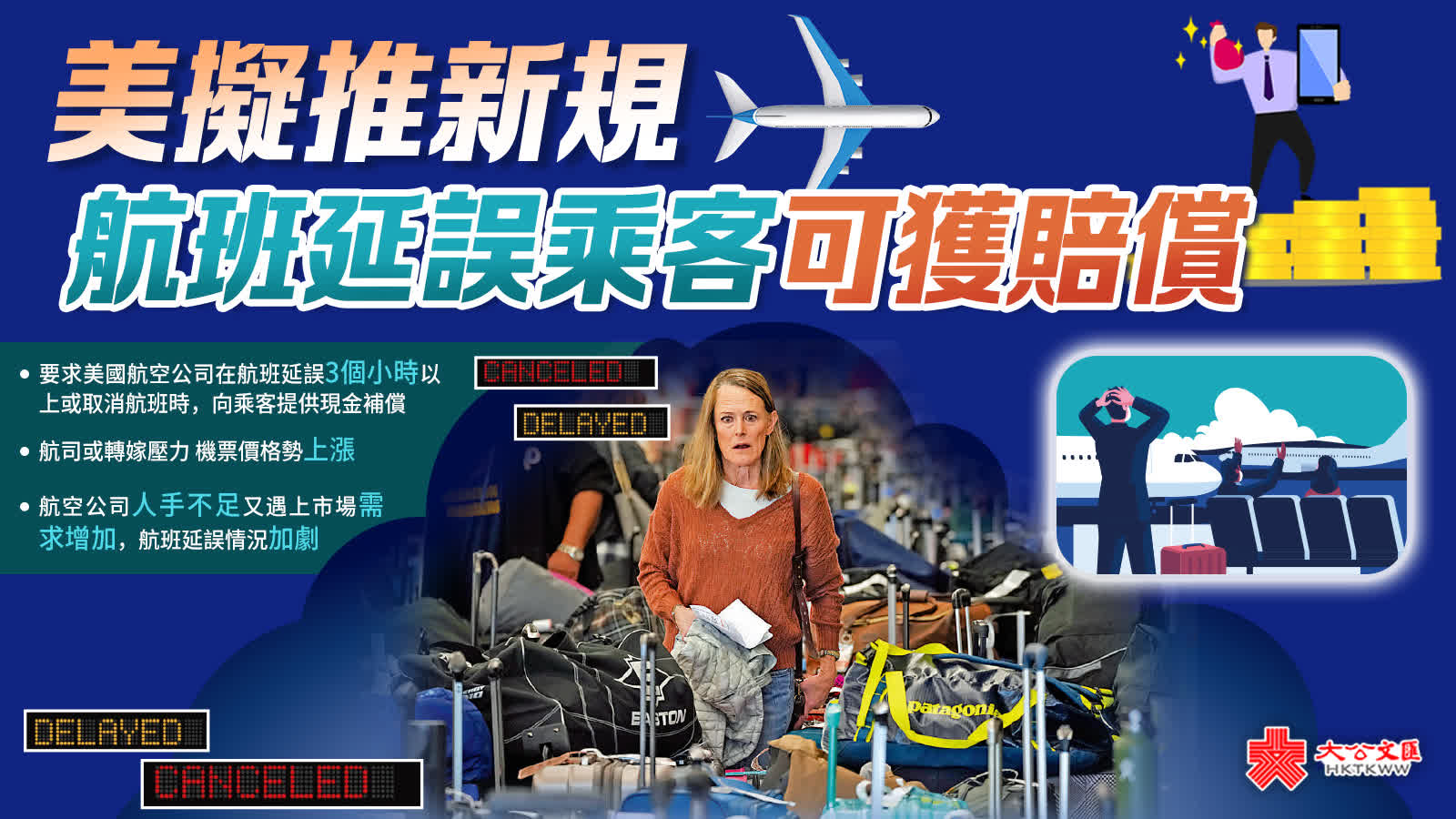 大公報綜合路透社、美聯社報道:美國政府8日透露,正着手制定新規,將要求美國航空公司在航班延誤3個小時以上或取消航班時,向乘客提供現金補償。據悉,相關計劃將於今年年底前提出。目前,美國只有極少數航空公司願意就航班延誤向乘客提供積分、代金券或飛行里程等作為補償。不過,這一新規定未來可能會導致機票變貴的情況。