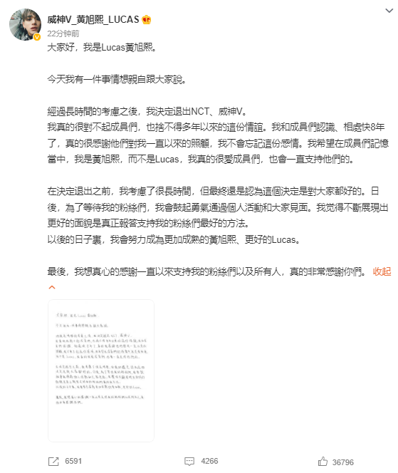 韓國SM娛樂公司今日(10日)宣布,Lucas(黃旭熙)正式退出男團NCT以及威神V,將繼續以個人形式展開活動。