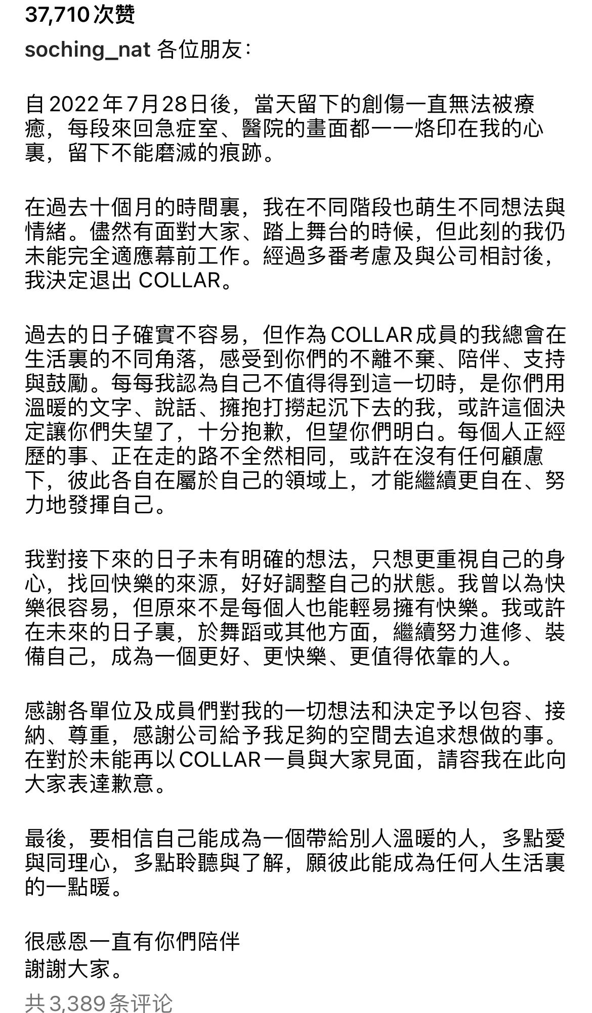 So Ching表示,「自2022年7月28日後,當天留下的創傷一直無法被療癒,每段來回急症室、醫院的畫面都一一烙印在我的心裏,留下不能磨滅的痕跡。」在過去十個月的時間裏,她在不同階段也萌生不同想法與情緒。儘然有面對大家、踏上舞台的時候,但此刻的她仍未能完全適應幕前工作。經過多番考慮及與公司商討後,決定退出COLLAR。