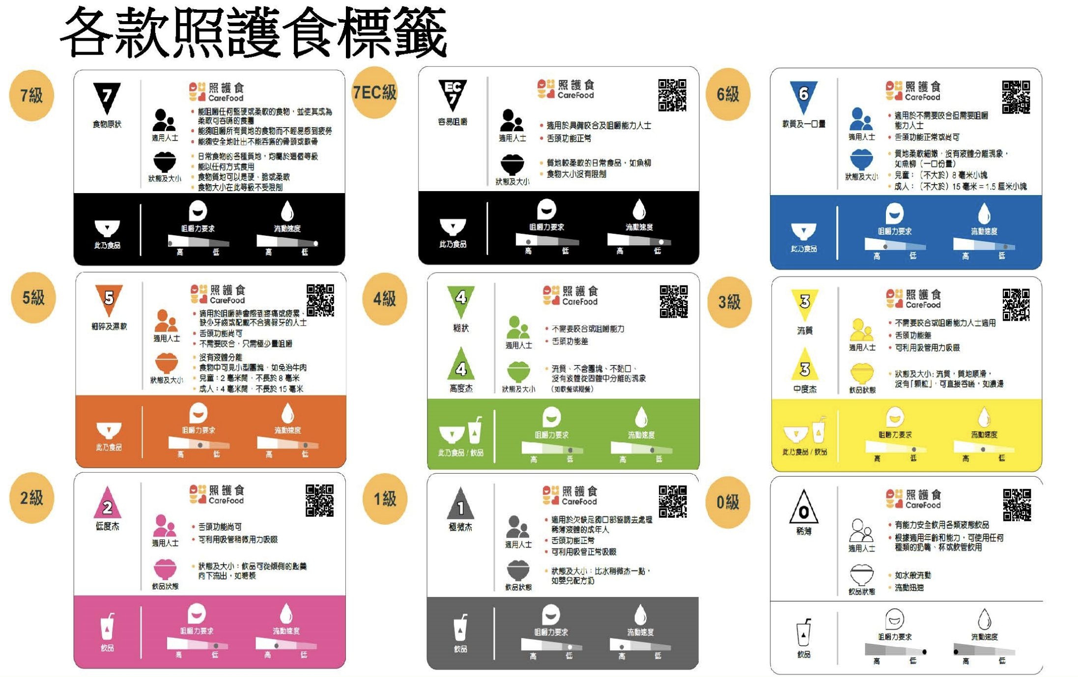 根據《照護食標準指引》,將食物及飲品的狀態劃分為9個等級,例如稀薄如水為0級,細碎及濕軟為5級,至於7級則為食物原狀。一般個人照顧者或院舍人員可以用餐叉、餐匙及針筒測試食物和飲品的形態;至於食品生產商則可使用特定測試儀器取得科學化數據,以更精準地生產「照護食」食品和飲品。