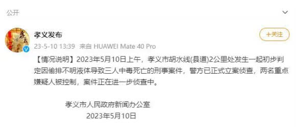 據新華社報道,山西省孝義市政府新聞辦發布消息稱,今日(5月10日)上午,孝義市胡水線(縣道)2公里處發生一起因偷排不明液體導致3人中毒死亡的刑事案件。