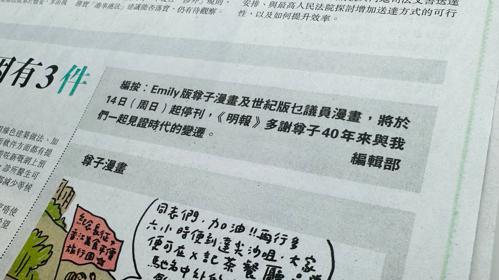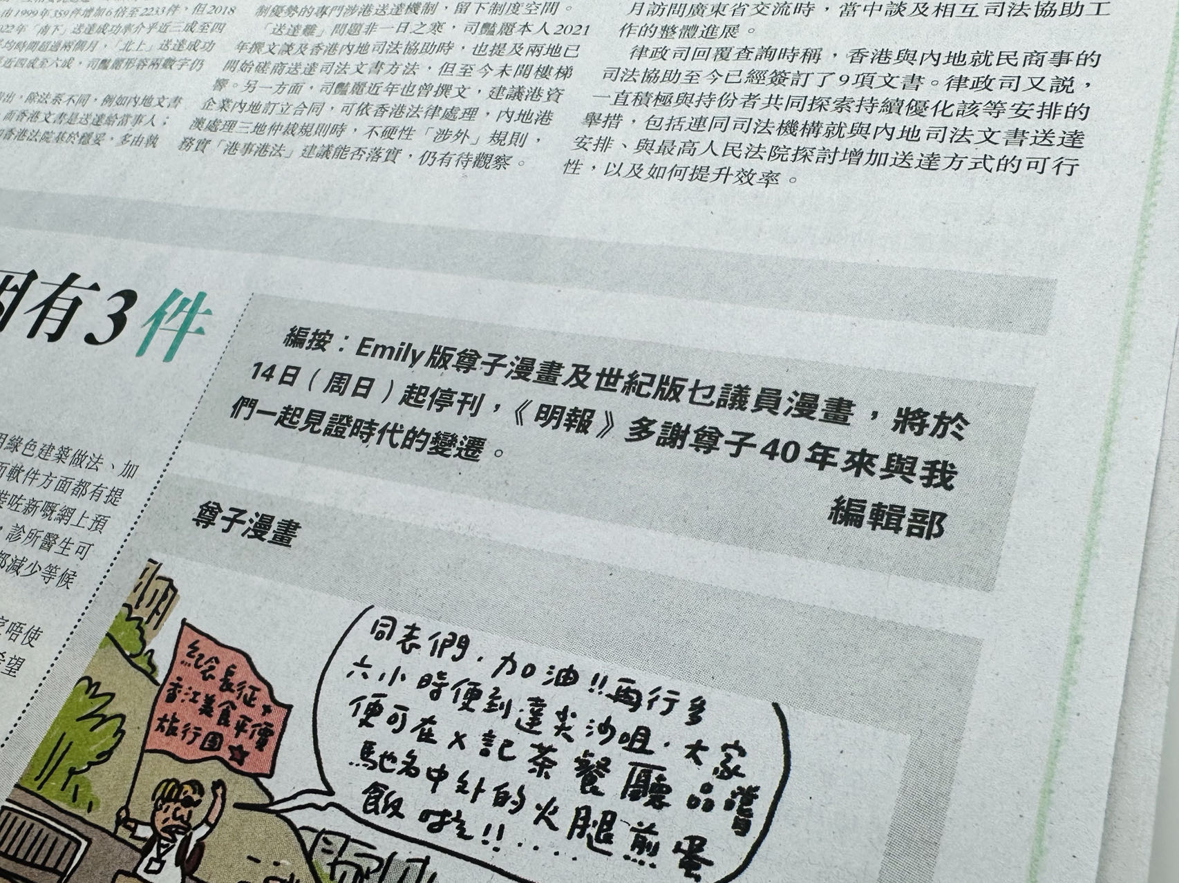 大公文匯全媒體報道:《明報》今日(11日)在報章刊登通知,指將於星期日(14日)起停刊「尊子漫畫」和世紀版乜議員漫畫,但未有交代停刊原因。