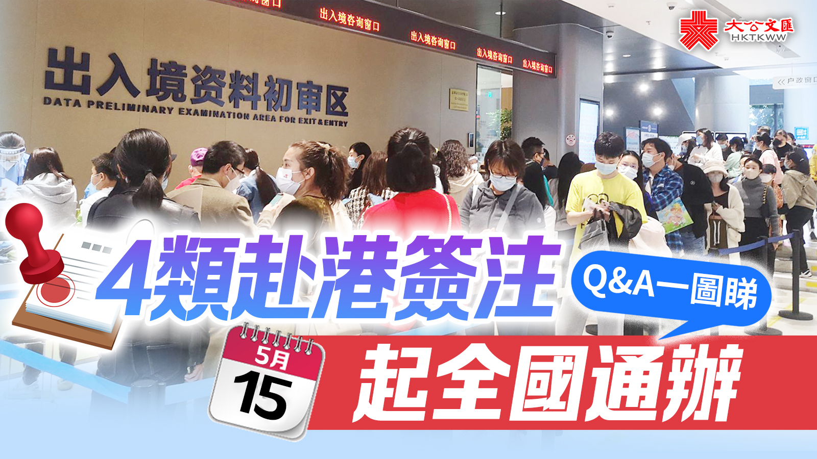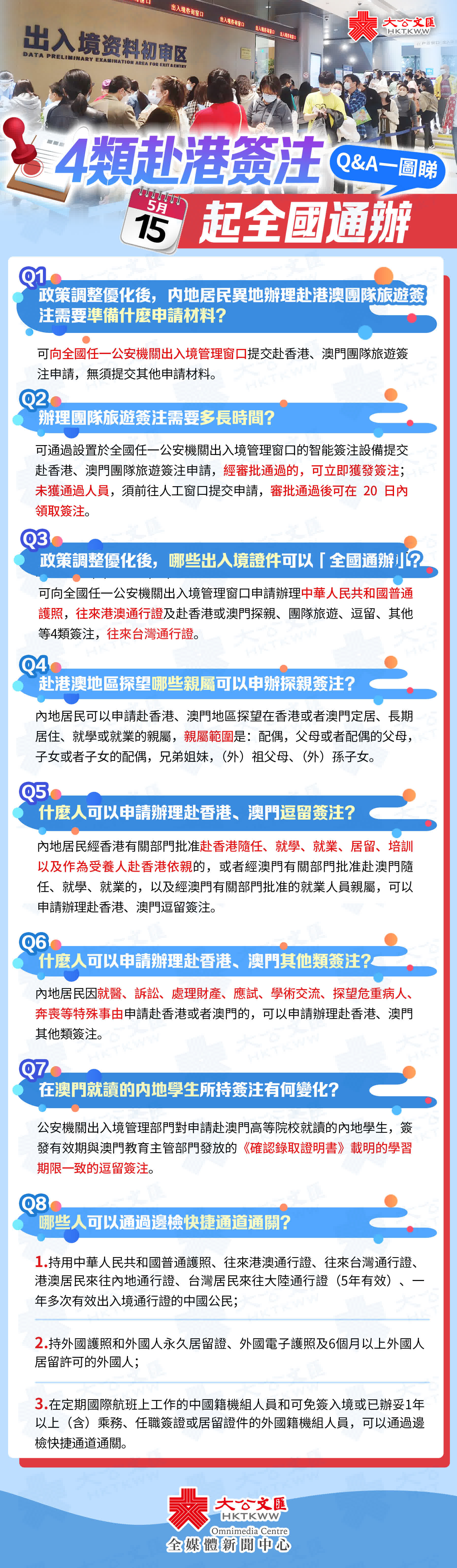 大公文匯全媒體報道,內地下星期一(5月15日)起,進一步調整優化出入境管理政策措施。內地居民可向全國任何公安機關出入境管理機構提交赴香港、澳門團隊旅遊簽注申請,以及探親、工作、學習證件。國家移民管理局今日(11日)發布《進一步調整優化出入境管理政策措施「問與答」》,解答關於申辦證件及簽注的常見問題。