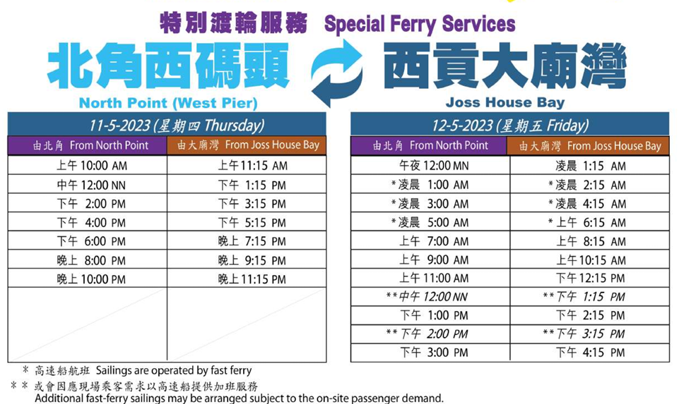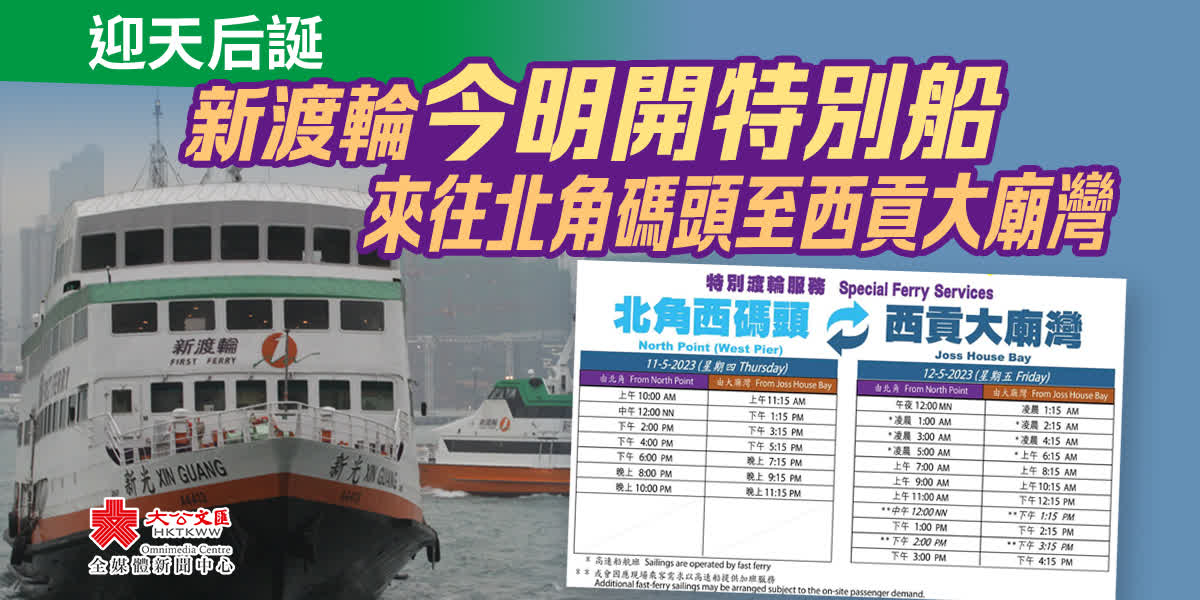 大公文匯全媒體報道,西貢大廟灣有本港現存最古老的天后廟,其建於南宋理宗時期,屬香港一級歷史建築,每逢天后寶誕都有大批善信前往參拜。新渡輪表示,會於天后誕前夕及正日,即今日(11日)及明日安排特別渡輪服務,往來北角碼頭及西貢大廟灣。