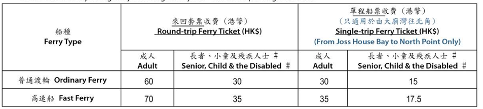 乘客可於上述兩日在北角碼頭(只售來回套票)及西貢大廟灣(只售前往北角之單程票)購買船票。乘客憑西貢大廟灣往北角的船票票據或八達通紀錄,可於當天北角往紅磡或北角往九龍城的渡輪服務時間內,免費乘搭北角往紅磡或九龍城的渡輪服務一次。相關乘客須使用已繳付西貢大廟灣往北角船費的八達通卡,於北角碼頭指定八達通閘機拍卡入閘,方可享用有關優惠。
