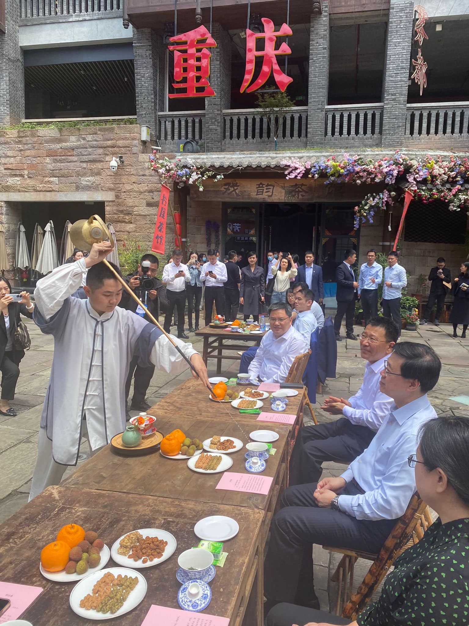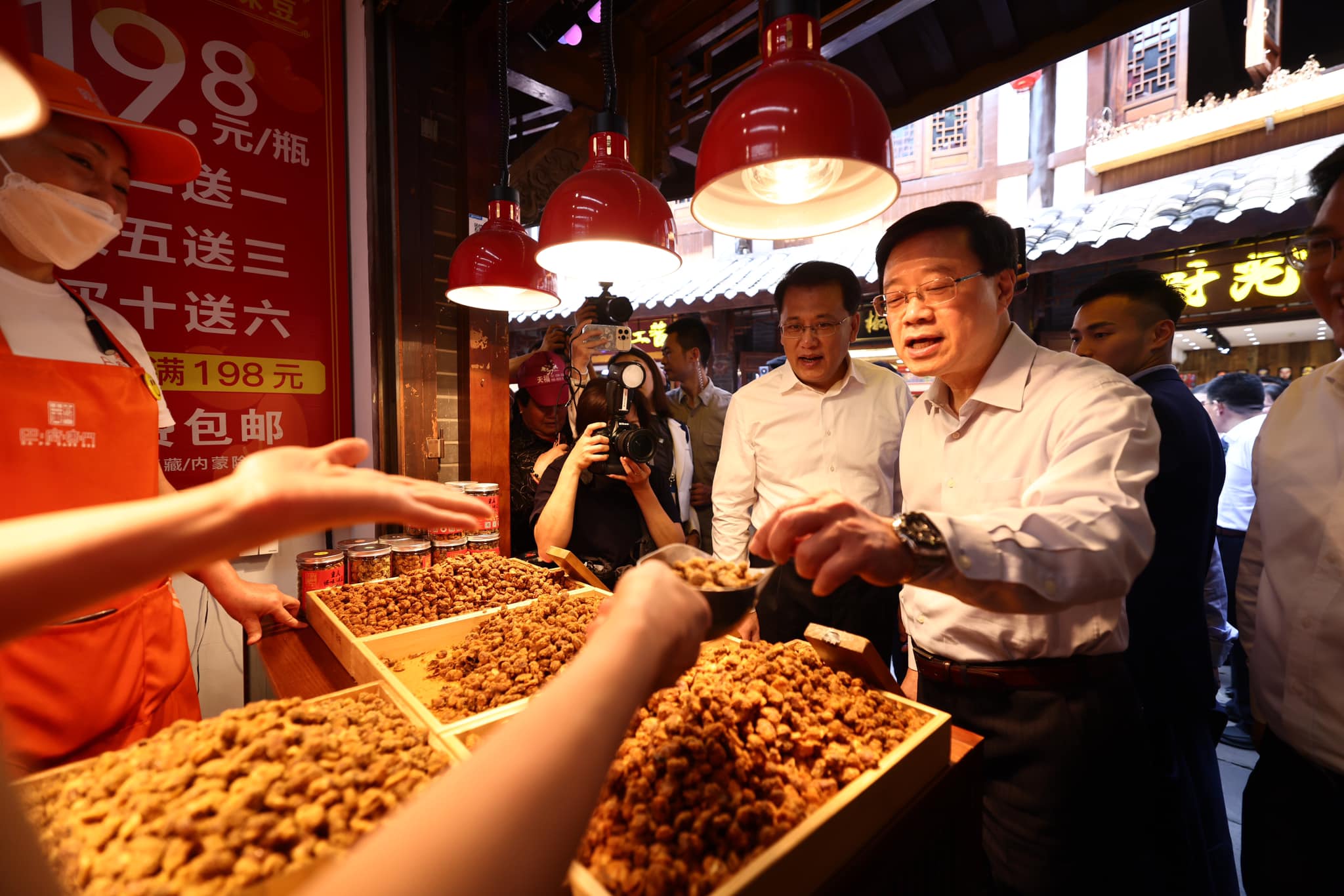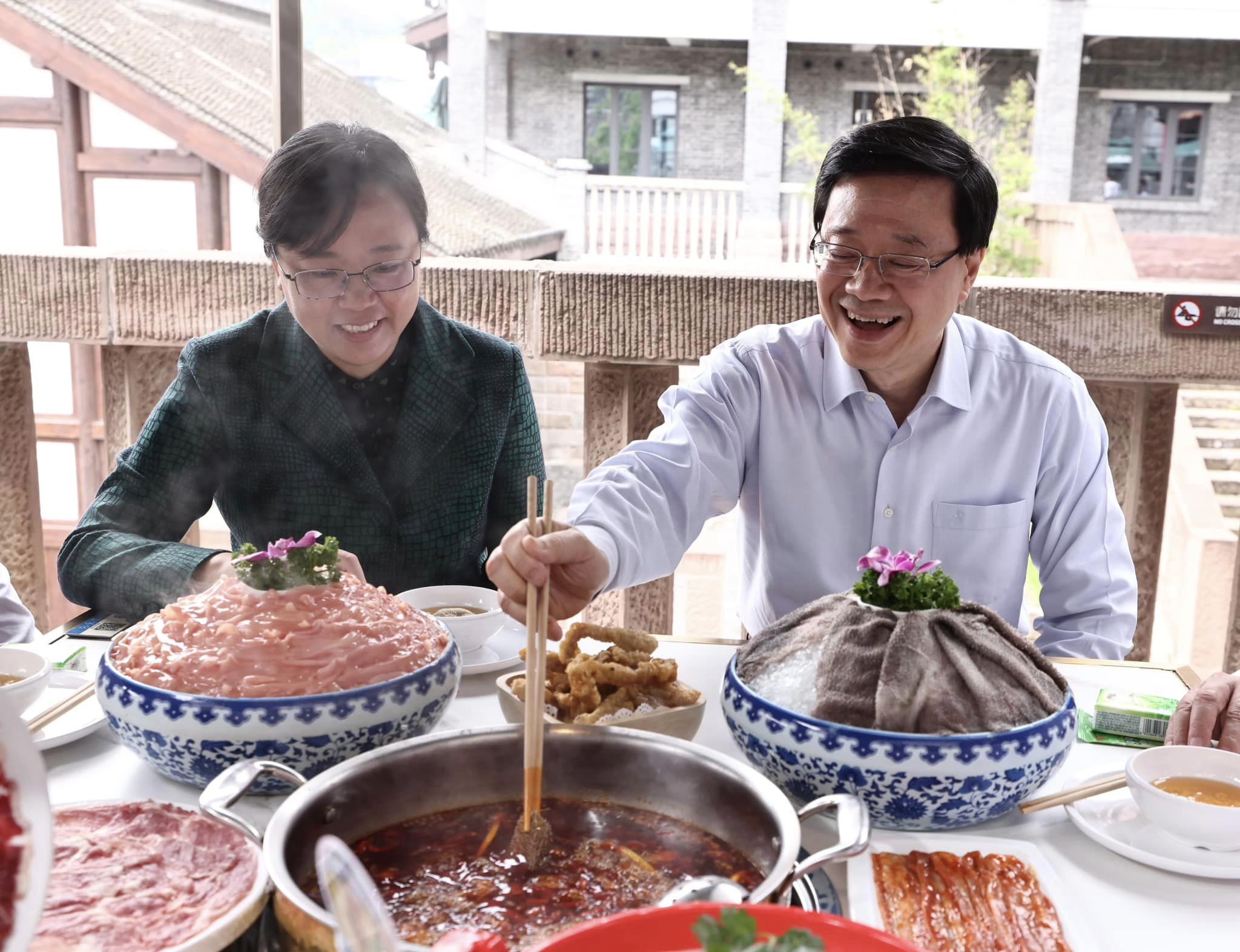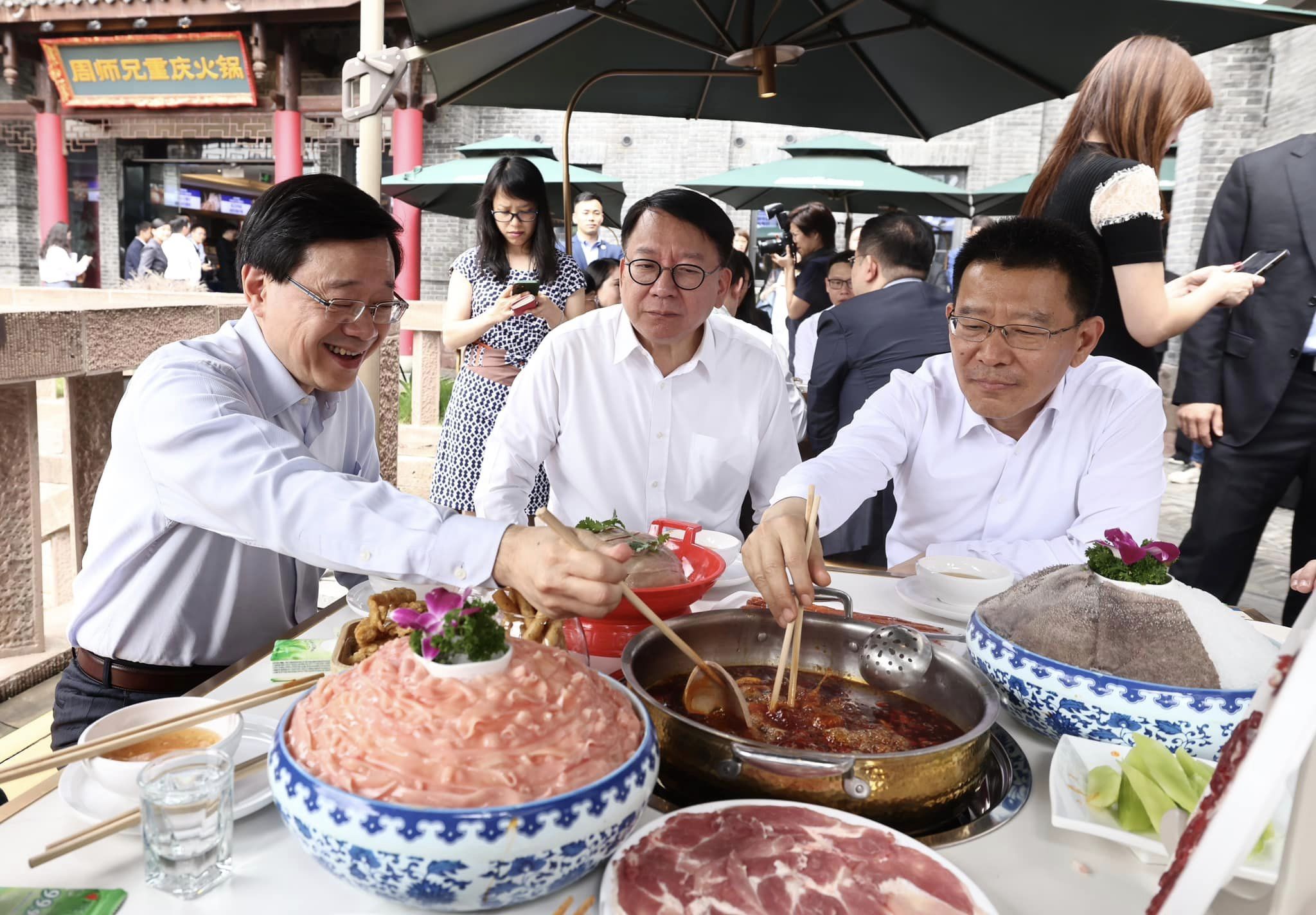 李家超提到,中午我們與重慶市副市長張國智到磁器口歷史街區的一家火鍋店,品嘗重慶麻辣火鍋,大家都吃得津津有味。他笑言,「對於能挑戰正宗的麻辣火鍋,我和團隊中幾位好辣之人都感到興奮!大家還有什麼重慶美食推介?」
