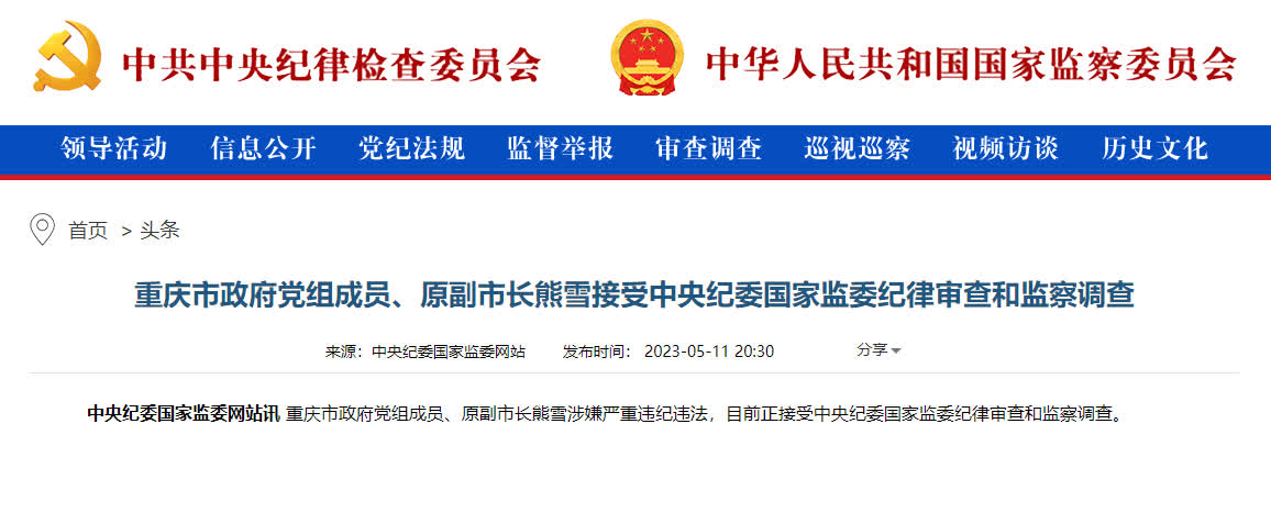 5月11日晚,中央紀委國家監委網站發布消息:重慶市政府黨組成員、原副市長熊雪涉嫌嚴重違紀違法,目前正接受中央紀委國家監委紀律審查和監察調查。