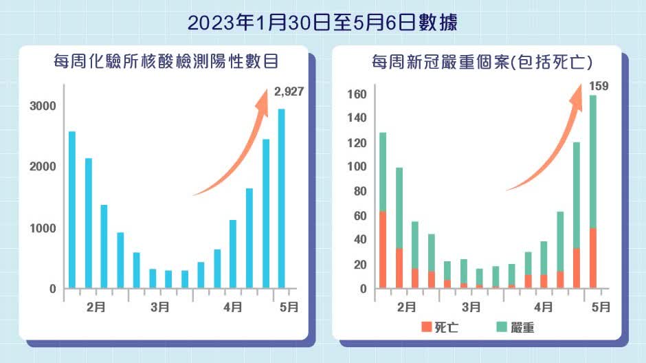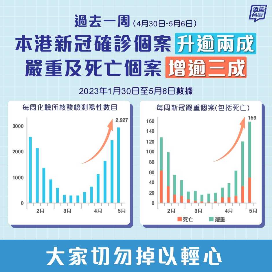 大公文匯全媒體報道,世衞早前指出,新冠情況已不再構成「國際關注的突發公共衞生事件」,但大流行仍然持續。政府今日(11日)表示,本港新冠病毒過去一周(4月30日-5月6日)仍然活躍,化驗所核酸檢測陽性個案再多2927宗,較之前一周增幅超過2成;嚴重及死亡個案亦上升至159宗,與之前一周的119宗相比,增幅超過3成。