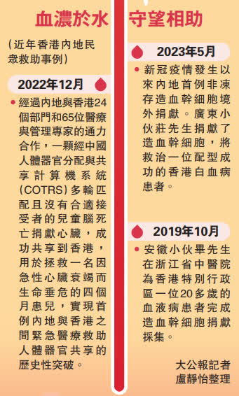 兩地關係血濃於水,港人接受內地同胞捐贈造血幹細胞非首次。在2019年10月,90後安徽籍青年畢昌林,為一位患病港人捐獻了240毫升造血幹細胞。