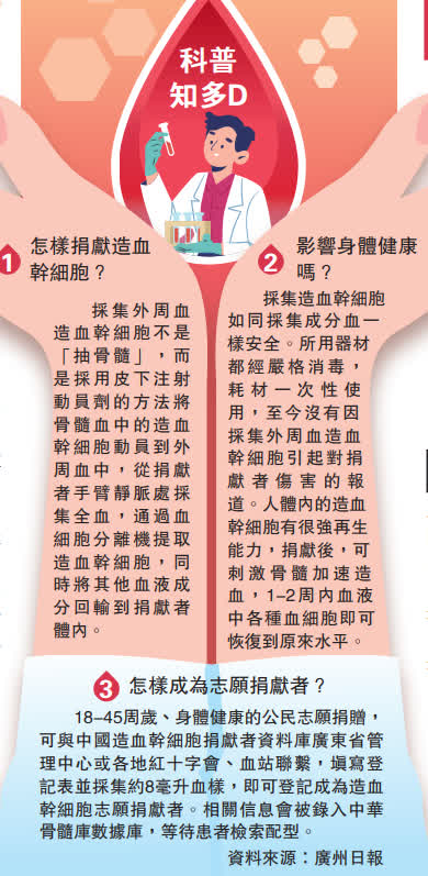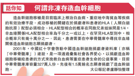 香港醫學會會董、兒科醫生陳以誠表示,要在本港尋找合適的幹細胞移植並不容易,但香港背靠祖國,內地擁有14億人口,若病人危急,從內地血庫尋求合適幹細胞移植,可為病人帶來希望。