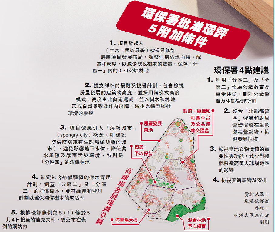 環保署發言人昨日表示,環保署署長已有條件批准該份環評報告,但附帶5項條件,包括要求項目發起人(即土木工程拓展署)提交經修訂的發展布局,檢視及調整房屋佔地面積、配置和密度,以保育分區一內的林地;要提交景觀及視覺計劃,涵蓋項目的樓宇高度,採取階梯式建屋模式,以及減少砍伐樹木等(見表)。