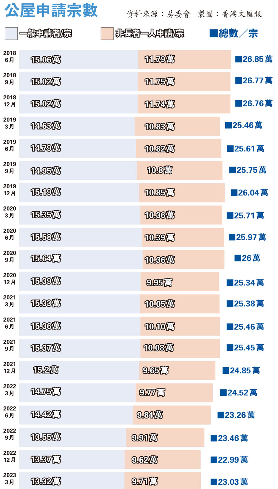 另外,今年3月底的公屋輪候冊顯示,約有133,200宗一般公屋申請,以及約97,100宗非長者一人申請,即合共約230,300宗申請個案。
