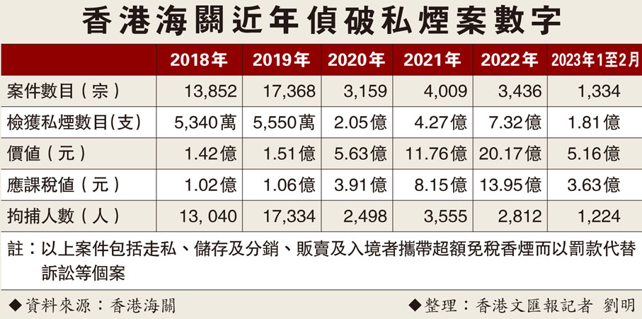 香港海關今年首兩個月已檢獲1.81億支走私香煙,拘捕了1,224名涉案者,較以往幾年檢獲的數字均有增加,主要是透過情報主導鎖定目標,搜查偷運私煙的貨櫃起獲大量私煙。對於巿面有不少售賣懷疑私煙的零售點,香港海關昨日回覆香港文匯報表示,會從不同層面包括在各區進行監察,全方位予以打擊。