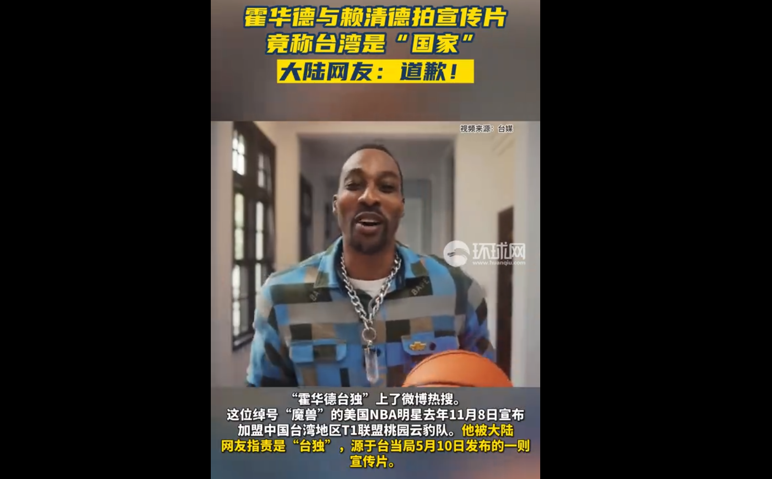 (大公文匯全媒體報道)這兩日,「霍華德台獨」上了微博熱搜。霍華德是綽號「魔獸」的美國NBA明星,去年11月8日宣布加盟中國台灣地區T1聯盟桃園雲豹隊。他被大陸網友指責是「台獨」,源於台當局10日發布的一則宣傳片。