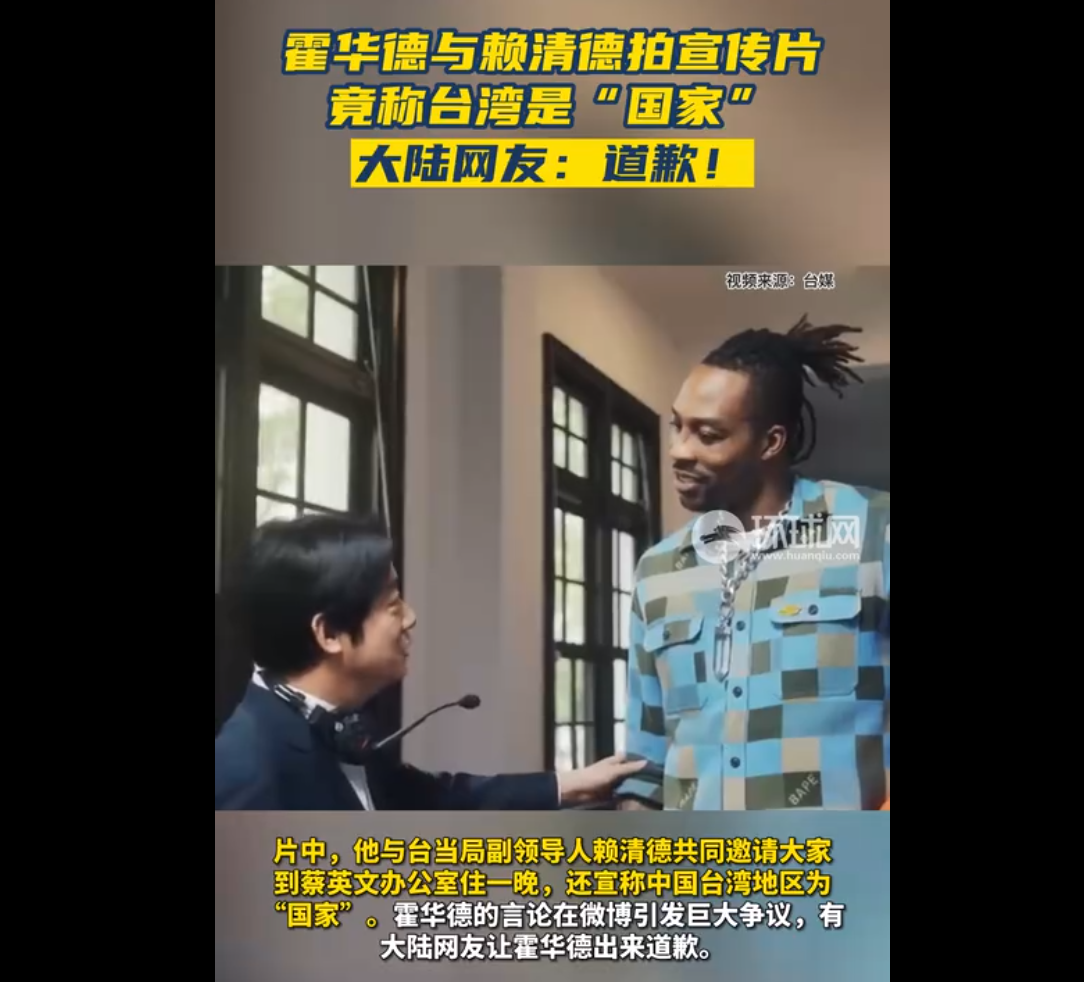片中,他與台當局副領導人賴清德共同邀請大家到蔡英文辦公室住一晚,還宣稱中國台灣地區為「國家」。霍華德的言論在微博引發巨大爭議,有大陸網友讓霍華德出來道歉。