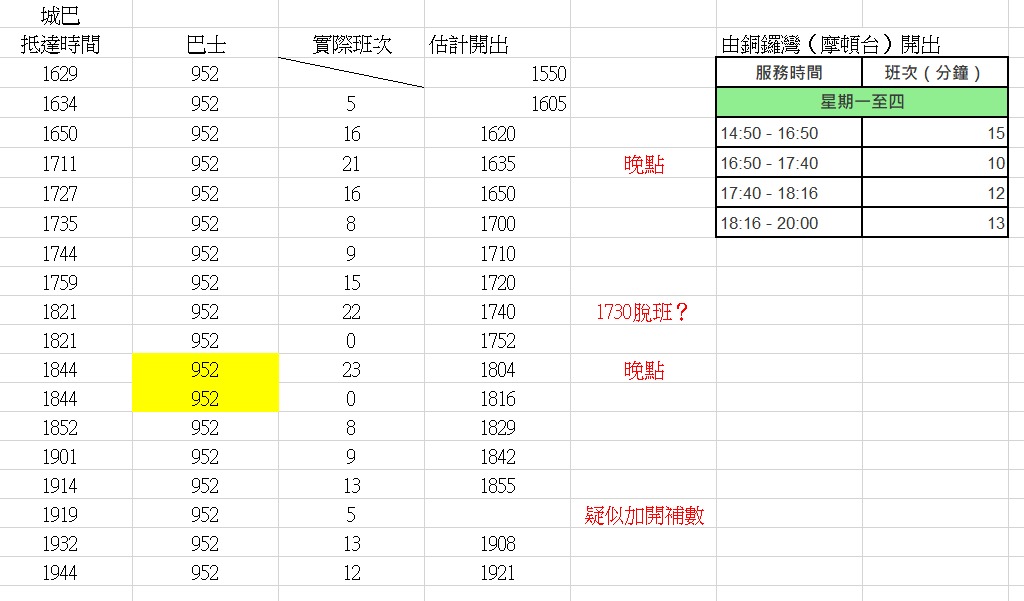 而城巴952就更為古怪。記者發現,該路線居然可以連續兩次有兩架巴士同時抵達,例如在18:21和18:44的時段,相信問題與路面狀況無關。