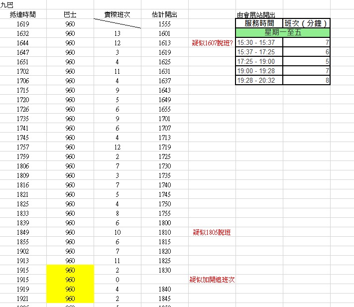 但記者發現,有個別班次疑似有脫班問題,包括九巴960、961和城巴952。以九巴960為例,抵達西隧收費廣場的時間分別為16:19,16:32和16:44,實際班次相差約12至13分鐘,似乎跟不上每班6至7分鐘的服務要求。