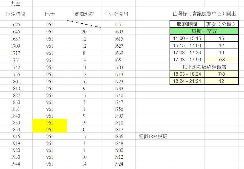 至於九巴961,按道理於18:03後大概維持7至12分鐘一班。不過,記者留意到,該路線要不「遲大到」,要不幾乎同時抵達,例如有六班在18:40、18:59、18:59、19:16、19:19和19:20抵達,相差由0分鐘至19分鐘不等。