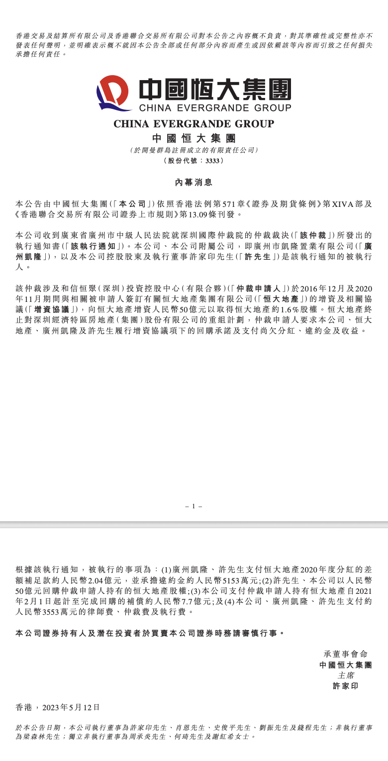 大公文匯全媒體報道,中國恒大於今日(12日)在聯交所發布公告表示,收到廣東省廣州市中級人民法院就深圳國際仲裁院2022年12月21日的仲裁裁決所發出的執行通知書,中國恒大、中國恒大附屬公司廣州凱隆置業有限公司(「廣州凱隆」),以及中國恒大控股股東、執行董事許家印是該執行通知的被執行人。