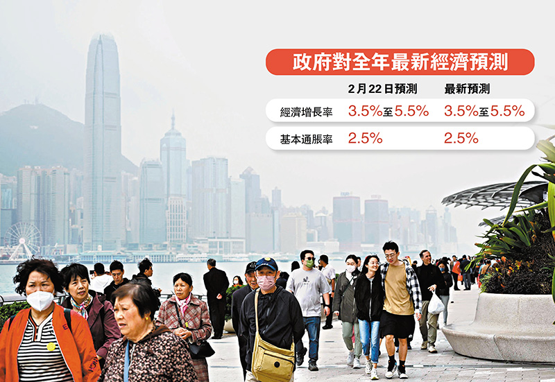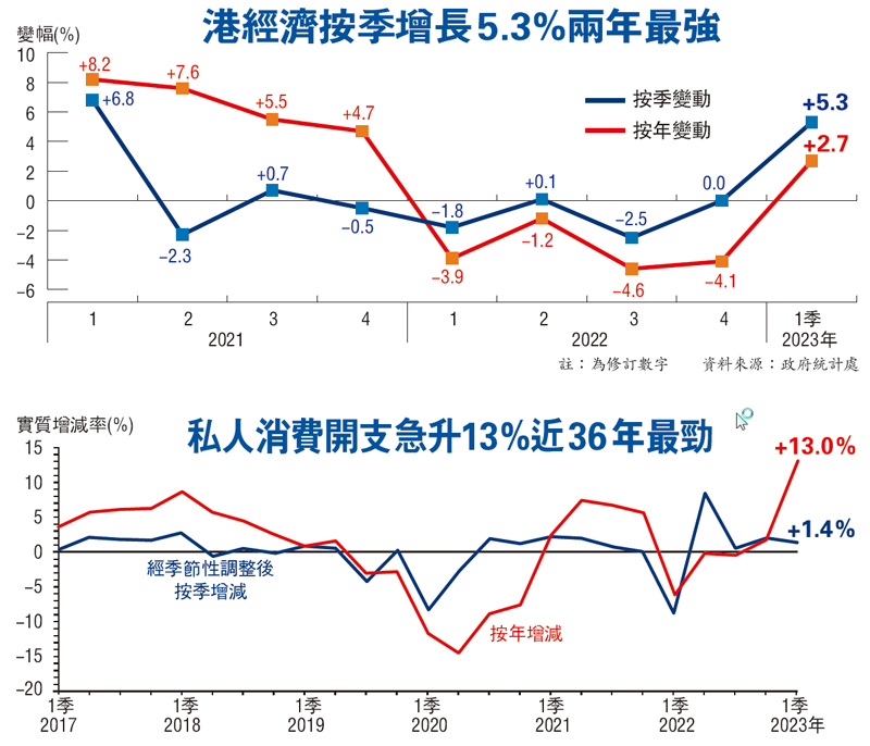 (香港文匯報 記者 莊程敏)在旅遊業及消費需求帶動下,本港今年首季經濟明顯改善。政府昨公布首季GDP修訂數字,按年增2.7%與預估一致,終止先前連續4個季度的跌勢。經季節性調整後,按季急升5.3%,是兩年來最強反彈。政府經濟顧問梁永勝昨指出,本港目前整體消費信心較之前增強,「好多以前做唔到的現在可做」,料今年疫後復常及經濟轉好的因素可抵消息口上升、出口下跌等負面因素,維持今年經濟增長3.5%至5.5%的預測,若目前經濟復甦的動力持續,增長率將靠近預測區間上限,屆時將回復2019年疫前水平。