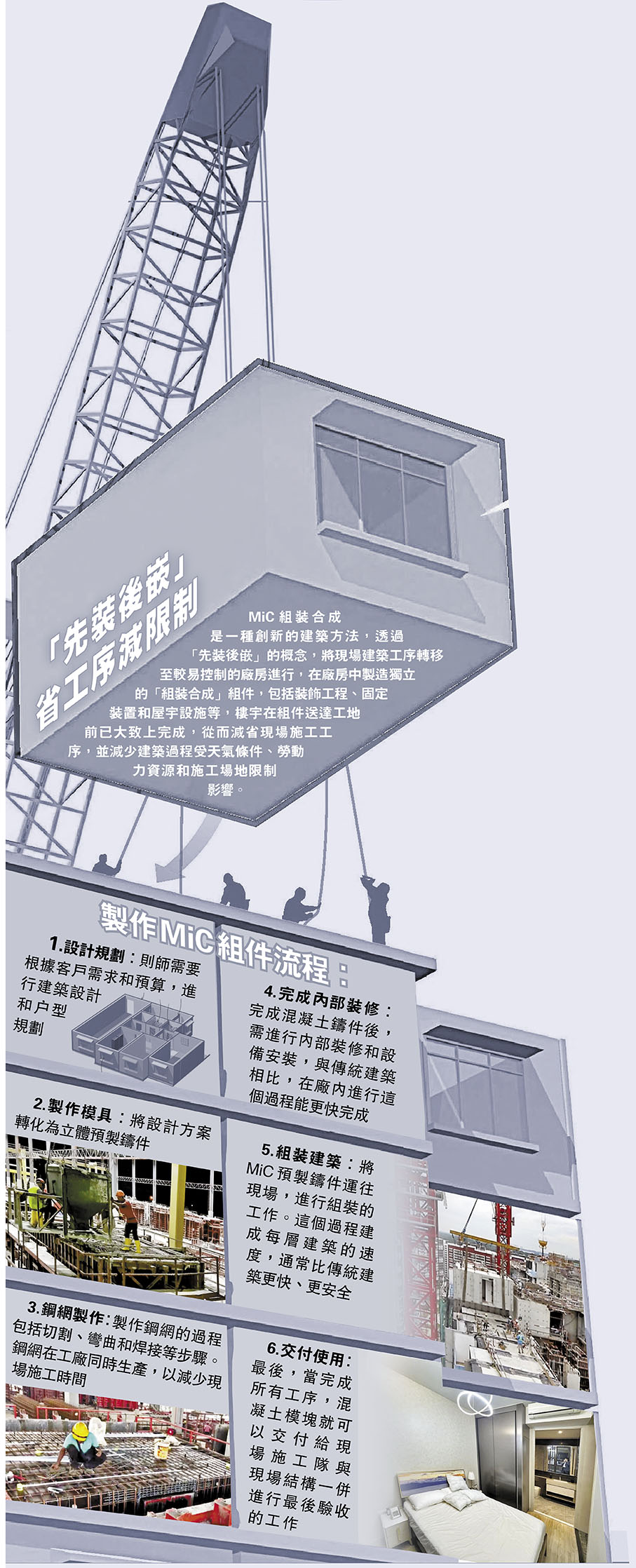 他介紹,在MiC工廠內,製作核心全靠一座經特別設計的自動化模具及用於搬動組件的重型電排吊車。MiC製作組件可塑性甚高,從落石屎開始,經過自動化模具處理後,組件雛形便形成,只要再按需要加上機電安裝及裝修,便可按需要變身為浴室、廚房或寢室。記者所見,工廠人員就像砌積木般,一個個預製組件快速疊建砌成,出廠運到施工地盤裝嵌,萬丈高樓也能快速落成,大大減省地盤現場的工序及建築時間。