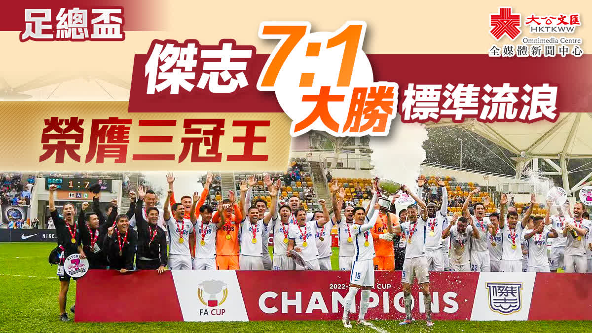大公文匯全媒體報道,本地足球賽事「足總盃」決賽今日(13日)在旺角大球場上演,標準流浪與傑志爭奪冠軍。雨水無阻球迷熱情,比賽共有3083人入場,最終傑志不負眾望以7:1大勝標準流浪,成功奪得足總盃冠軍。