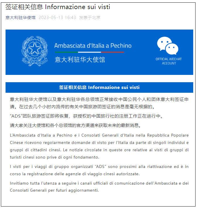據微信公眾號「意大利駐華使館」5月13日消息,意大利駐華大使館以及意大利駐華各總領館正常接收中國公民個人和團體意大利簽證申請。在過去幾個小時內流傳的有關中國旅遊團簽證的消息是毫無根據的。「ADS」團隊旅遊簽證即將恢復,獲授權的中國旅行社的註冊工作正在進行中。請大家關注大使館和各個總領館的官方渠道來獲取未來的最新消息。