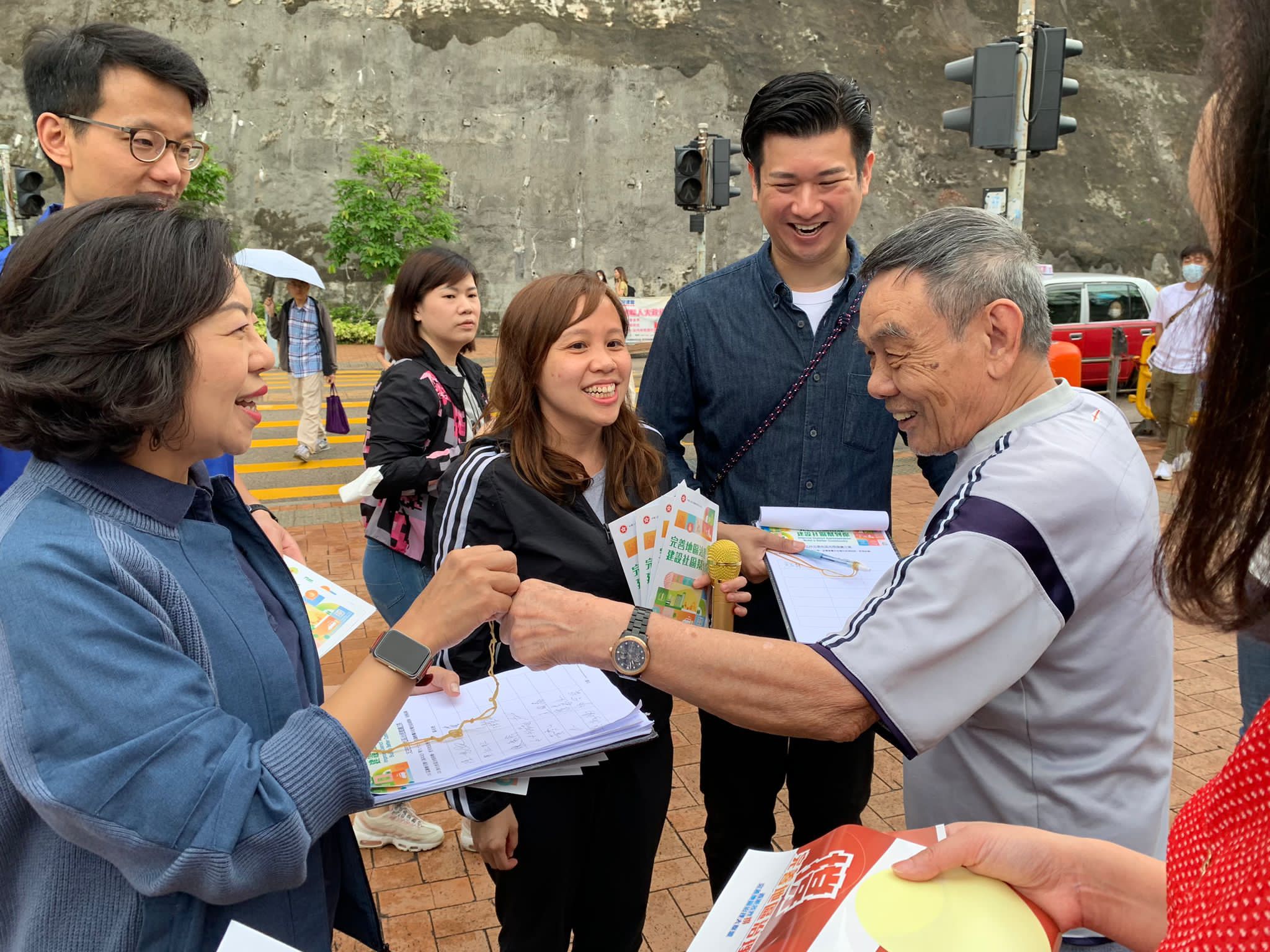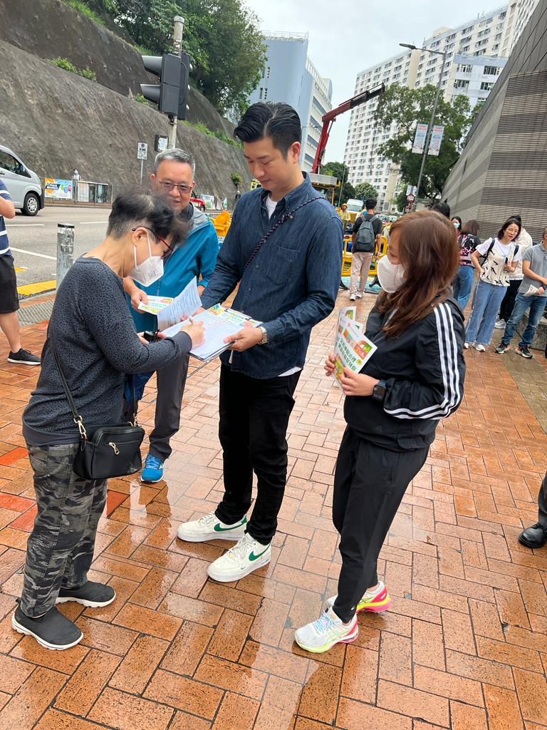 (大公文匯全媒體記者 周傾芫)落雨紛紛,澆不滅地區工作者宣傳區議會改革方案的熱情,澆不滅市民對新一屆區議會的期盼。今日(13日),18區民政事務專員召集當區的「地區撲滅罪行委員會」、「地區防火委員會」同「分區委員會」(統稱「三會」)委員設置街站,齊心協力宣傳完善地區治理,不少街坊都熱心主動簽名表示支持。民政及青年事務局局長麥美娟身體力行,分別到葵青、深水埗及黃大仙區,以及大埔、北區、元朗同屯門街站為「三會」委員打氣。