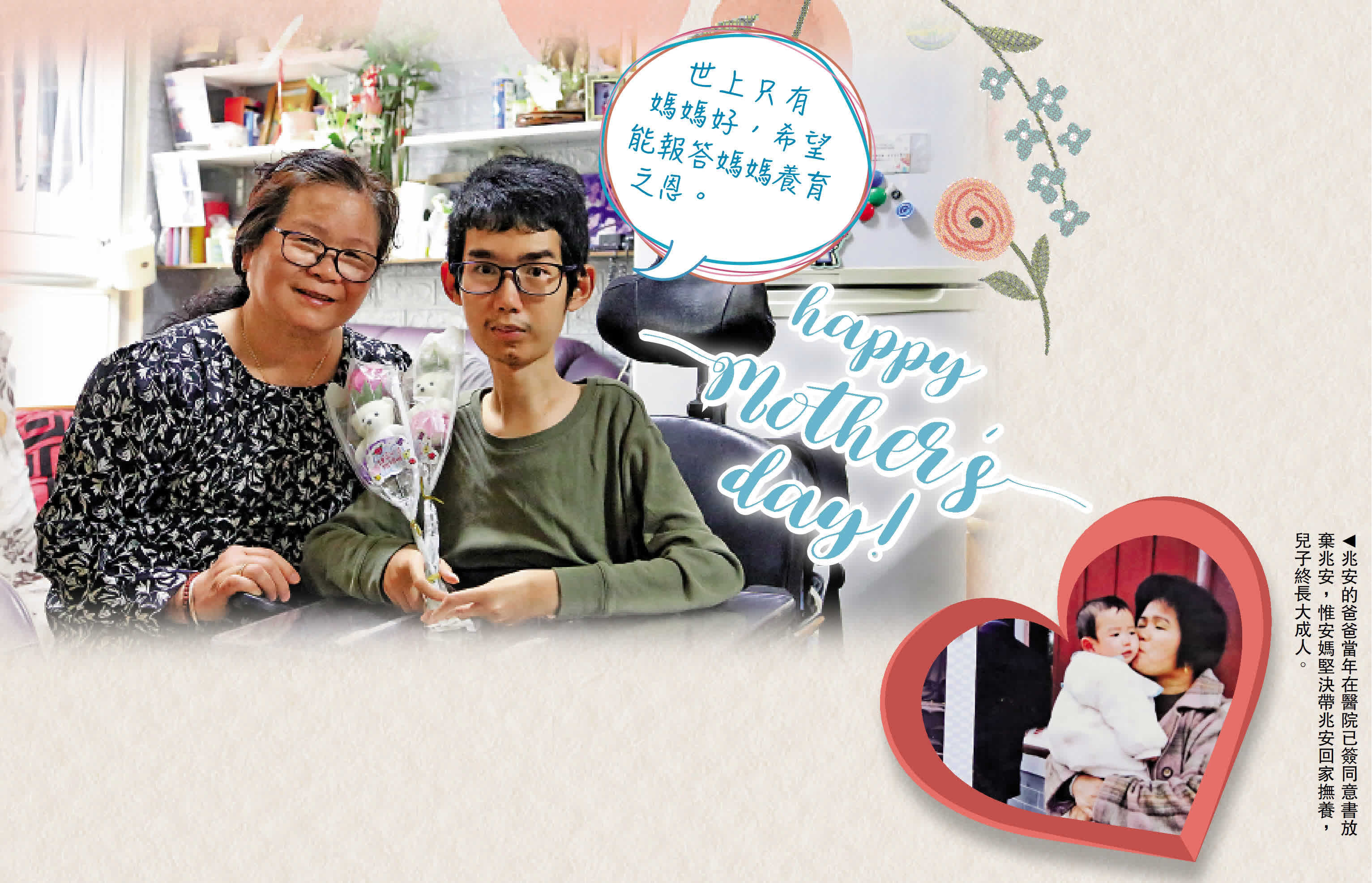 談到今天母親節如何慶祝?「我們都是在家裏聚餐,由姐姐煮幾道小菜,再加一些外賣。」患有SMA、坐於輪椅上的楊兆安表示,由於外出用膳價錢昂貴,又難以擺放輪椅,故多年來的母親節都在家裏慶祝,一家人「齊齊整整」吃一頓豐盛的晚飯,已感十分滿足。