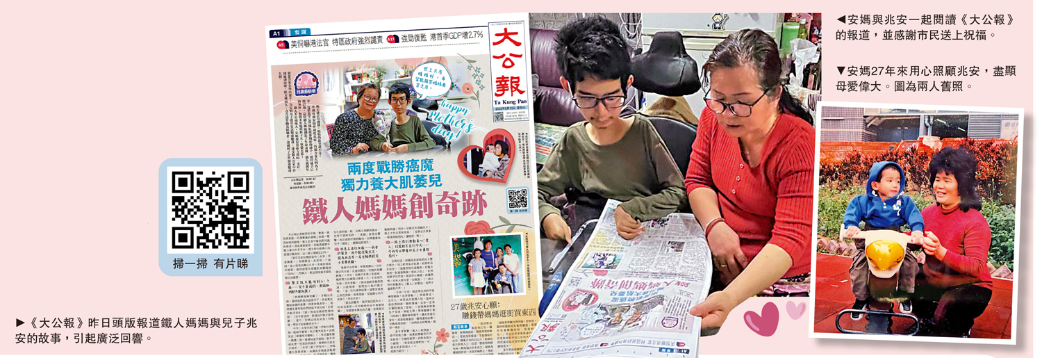 (大公報記者 余風、易曉彤)今天是母親節,祝願天下母親安康快樂!《大公報》昨天頭版報道,一名兩度患癌的鐵人媽媽「安媽」,憑着偉大母愛創奇跡,獨力照顧四名子女,當中還把一名被醫生斷言只能活到6、7歲、患有罕見脊髓肌肉萎縮症(SMA)的兒子養大,兒子今年已經27歲了。兩母子感謝《大公報》報道他們的故事,引來社會廣泛關注,市民紛紛送上祝福。