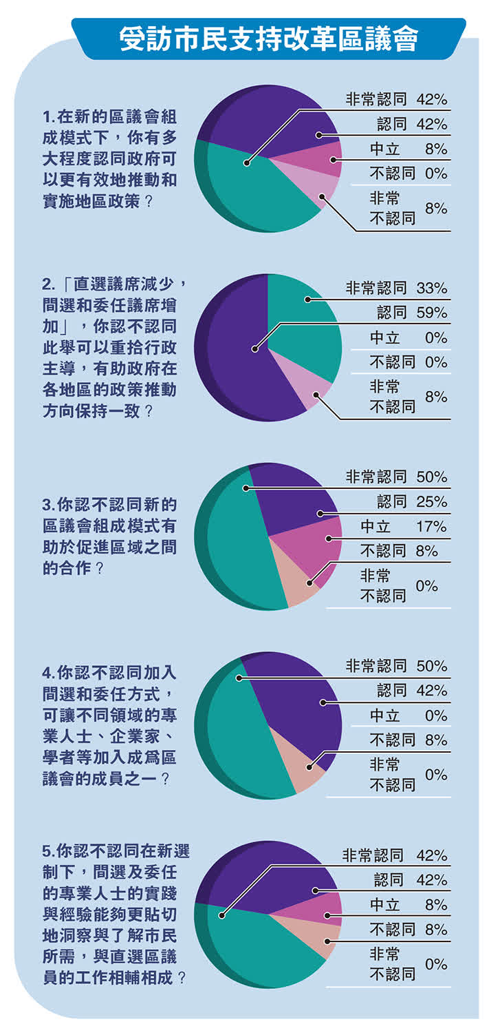 對於區議員組成模式等問題,有72%受訪者認同新的區議會組成模式有助於促進區域之間的合作;超過九成人認同加入間選和委任方式,可以讓不同領域的專業人士、企業家、學者等加入成為區議會成員;84%受訪者認同在新選制下,間選及委任的專業人士的實踐與經驗能夠更貼切地洞察與了解市民所需,與直選區議員的工作相輔相成,藉以「結果為目標」的方式去服務社會與市民。