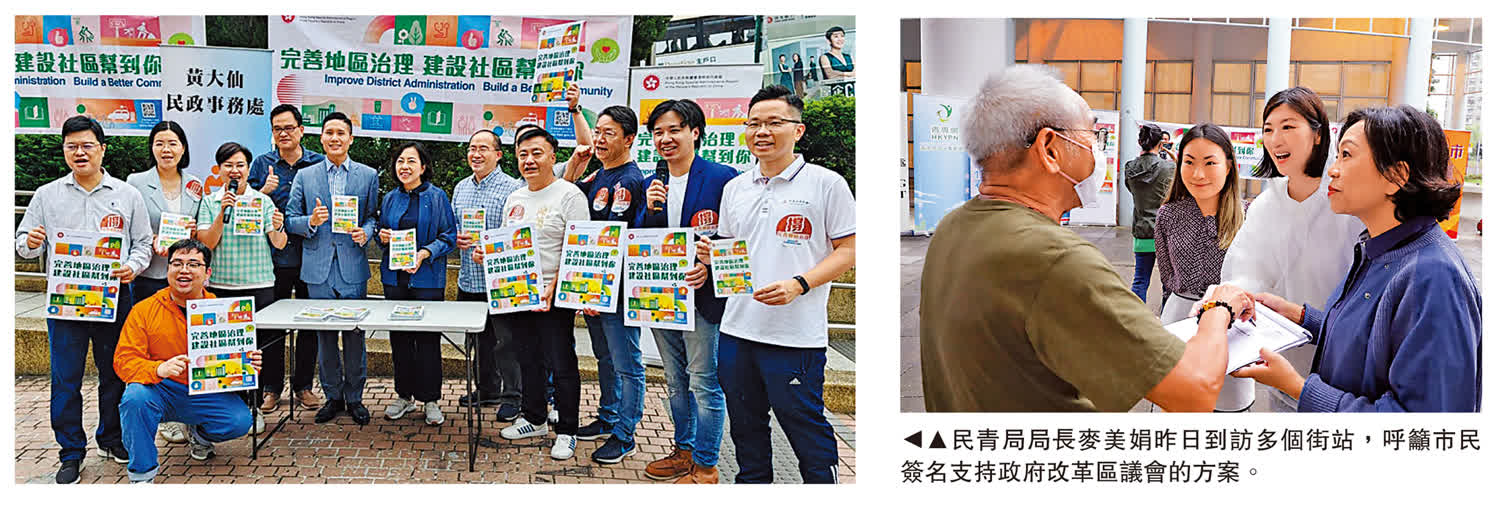 18區民政事務專員與各區「地區撲滅罪行委員會」、「地區防火委員會」及「分區委員會」(「三會」)委員昨日設置街站,向市民解釋完善地區治理建議方案,許多街坊都熱心主動簽名表示支持。民政及青年事務局局長麥美娟昨日亦到訪葵青、深水埗、黃大仙區及西貢等多個街站,為民政處同事、「三會」委員及義工們打氣。她形容市民支持方案,但強調仍要多進行解說工作。