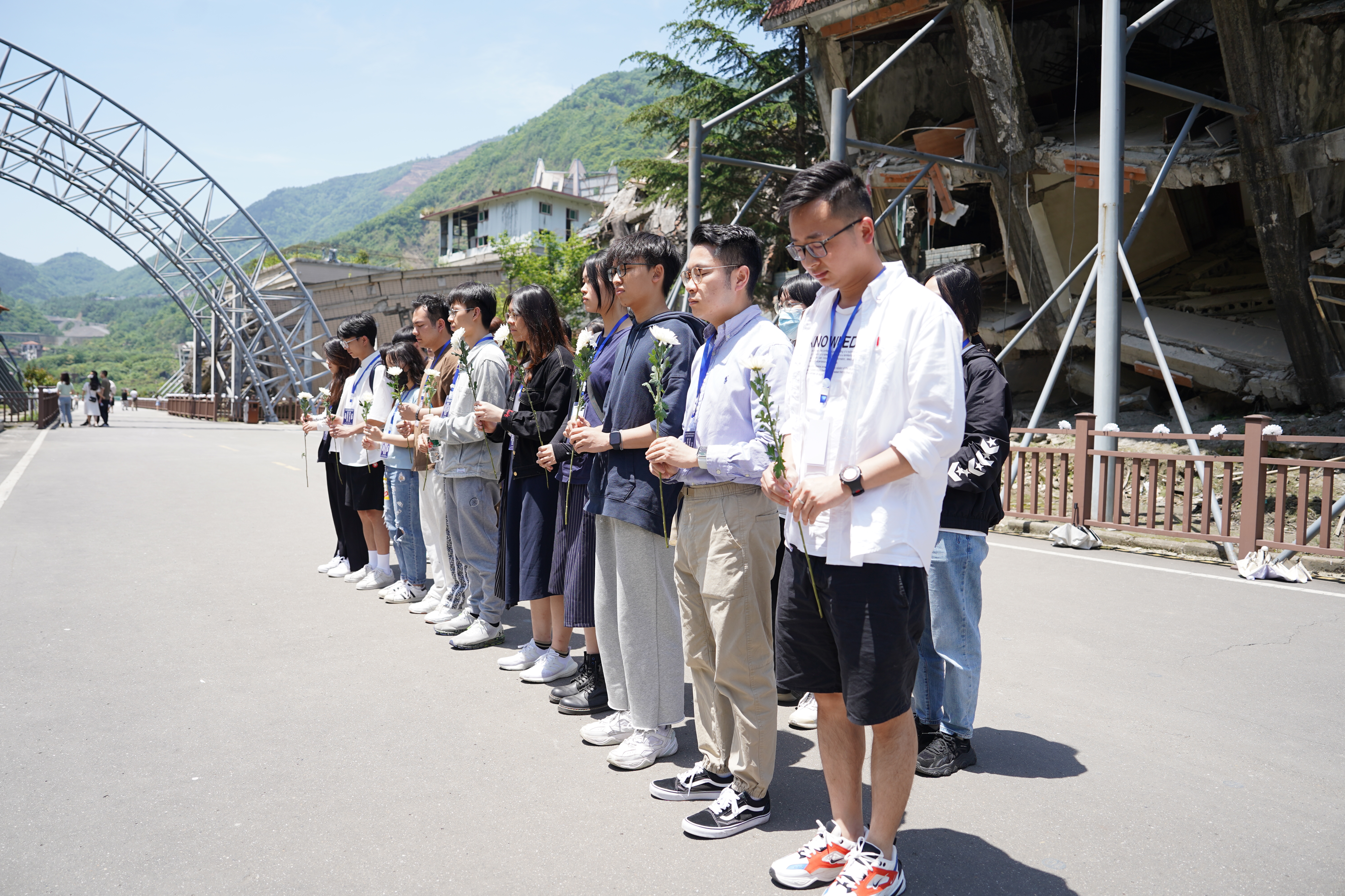 港澳台僑青年們先來到北川老縣城地震遺址,跟隨着講解員的步伐,慢慢走近地震遺址。映入眼帘的一片片廢墟,似乎在向大家訴說着當年地震的慘狀。在地震遺址公墓前,港澳台僑青年們低頭默哀,向在地震中遇難的同胞和在抗震救災中英勇捐軀的烈士敬獻鮮花。