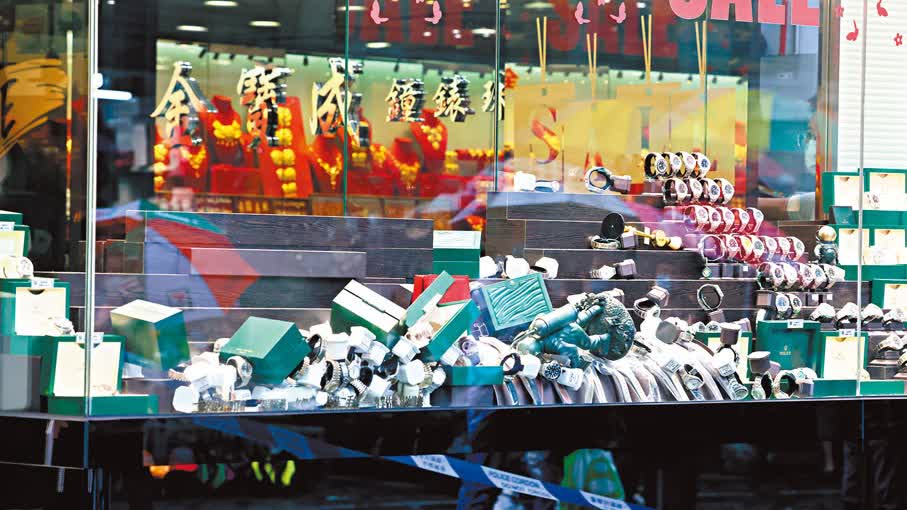 (香港文匯報 記者 蕭景源)本港近月接連發生嚴重店舖劫案,繼上周五(12日)有獨行匪打劫觀塘一間珠寶金行後,事隔僅兩日,另一間位於屯門的鐘錶珠寶行,昨母親節遭3名分別持刀和鐵鎚的男匪徒闖入打劫,1分鐘內掠去約120隻名貴手錶,包括勞力士,再登上附近一輛接應的私家車逃去。警方事後封鎖現場調查,又在附近展開兜截,惜無發現。經點算,店舖損失名錶總值約1,500萬元,是今年至今涉及最大金額的店舖劫案,亦是近9個月內發生的第七宗嚴重店舖劫案,合共涉及鐘錶等財物總值逾6,000萬元。