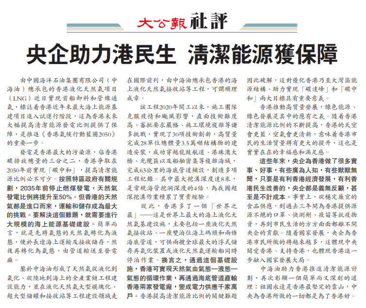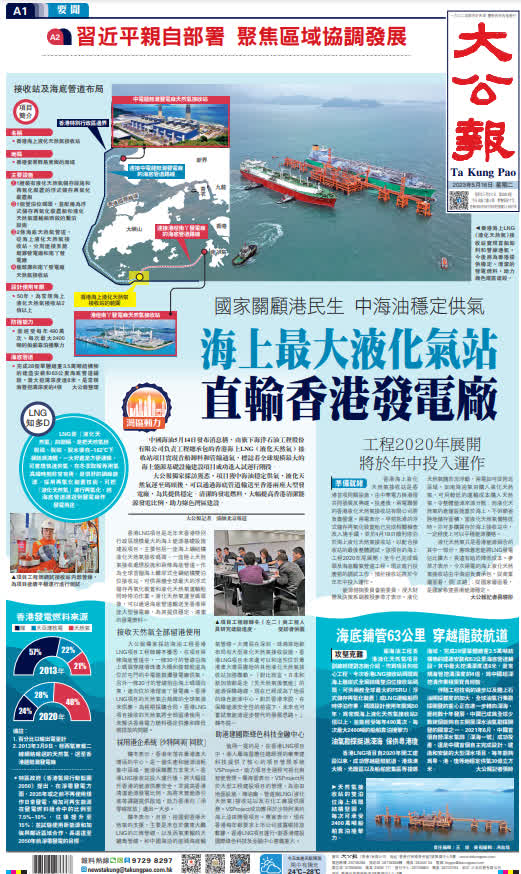 由中國海洋石油集團有限公司(中海油)總承包的香港液化天然氣項目(LNG)近日實現首船卸料和管線通氣,標誌着香港近年來最大海上能源基建項目進入試運行階段,這為香港未來大幅提高清潔能源發電比例提供了保障,是推進《香港氣候行動藍圖2050》的重要一步。