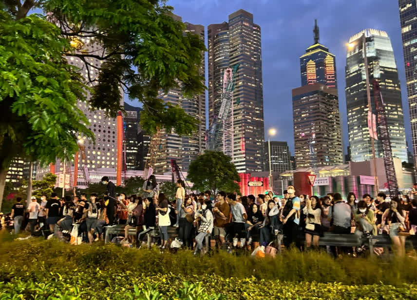 沒搶到綠地的,從添馬公園的盡頭左轉,來到海濱長廊和文化廣場——這裏看不到周杰倫演唱會的畫面,但可以清楚地聽見歌聲。