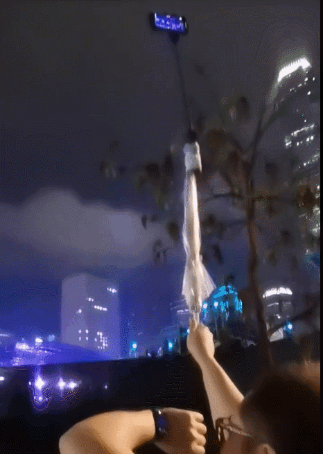 有粉絲帶着加長的自拍桿一路前行↓