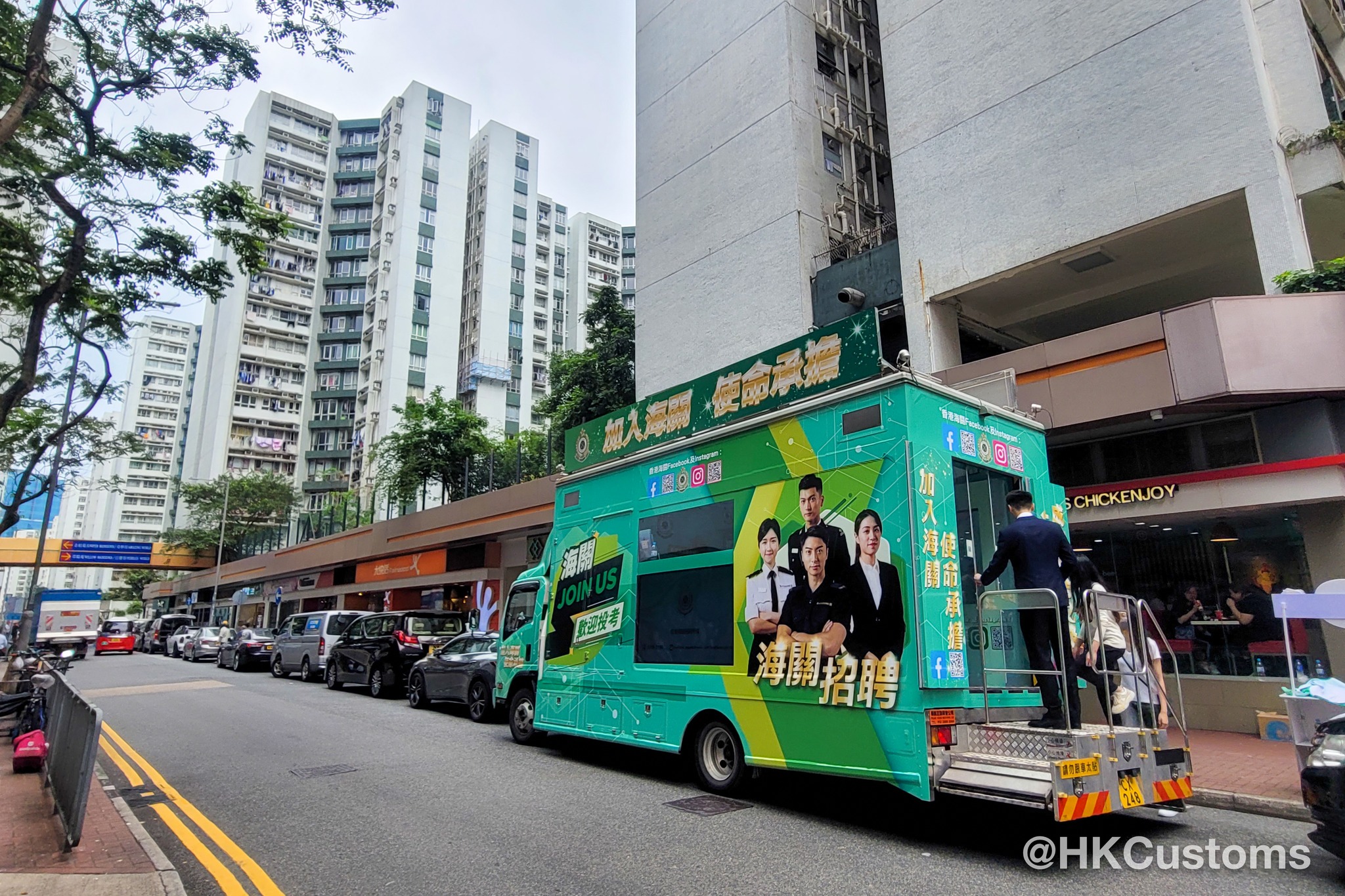 海關指,為配合招募工作,招聘宣傳車已經出動到全港各區進行招聘,車內除有部門資訊、部門不同工作範疇的介紹影片以及體能測驗示範影片外,亦有遴選程序準備貼士影片及過往試題,更有小測驗給參觀者牛刀小試。宣傳車內亦設有即場投考櫃台,供有興趣人士即場報名。