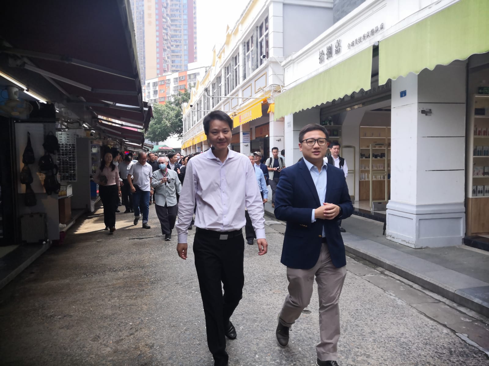 上午,考察團首先到達沙頭角中英街,參觀主街、中英街歷史博物館,實地調研沙頭角深港國際消費合作區建設情況。張欣宇表示,中英街最特別的是有香港及內地特色的融合,未來沙頭角墟及中英街的範圍應圍網管理,讓兩邊人民在其中自由流動,但出入境限制方面,規定香港及內地沿路返回,例如港人只能從香港的檢查站往返,而內地人則從內地檢查站往返,而兩地政府應設對口部門協調,處理跨境問題,發展文化創意、跨境電商、金融保險、購物旅遊等產業,以加強中英街的吸引力。