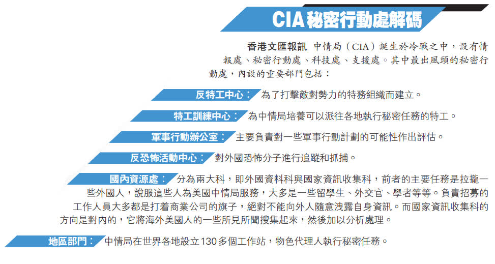 長期以來,美國中央情報局(CIA)是美國聯邦政府主要情報機構之一,總部位於美國弗吉尼亞州蘭利,下設情報處(DI)、秘密行動處(NCS) 、科技處(DS&T)、支援處(DS)四個部門。其主要業務範圍涉及:收集外國政府、公司和公民情報資訊;綜合分析處理其他美國情報機構收集的情報資訊;向美國高層決策者提供國家安全情報和安全風險評估意見;根據美國總統要求組織實施和指導監督跨境秘密活動等。