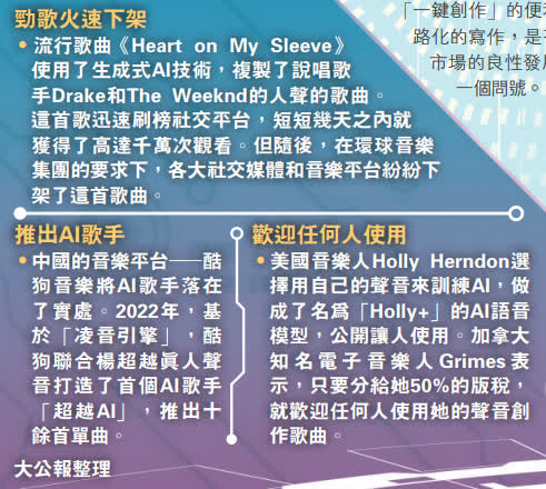 (大公報記者 張寶峰、胡若璋)繼繪畫、文案之後,AI又將觸手伸向了音樂圈。近日,在多個視頻及音樂平台上,「AI孫燕姿」儼然成為流量密碼,多個相關視頻收穫上百萬播放量。「AI周杰倫」、「AI陳奕迅」等虛擬歌手亦紛紛崛起,用「以假亂真」的音色,大量翻唱成名曲及他人歌曲,不僅賺足噱頭,還穩贏流量,甚至讓一眾忠實的歌迷粉絲「迷離雙耳」。AI技術再次被推至輿論的風口浪尖,有關AI歌手是否侵權的質疑聲,也紛至沓來。有法律界人士呼籲,應加強對於AI歌手運營主體的監管。