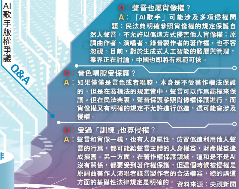 今年4月,國家互聯網信息辦公室發布《生成式人工智能服務管理辦法(徵求意見稿)》,其中擬規定:提供生成式人工智能產品或服務,應尊重知識產權、商業道德;用於生成式人工智能產品的預訓練、優化訓練數據,應不含有侵犯知識產權的內容。為此,有業界人士預計,隨着技術進步,當AI歌手應用於更多更具體的商業場景後,現行法律和監管體系可能面臨新的挑戰。