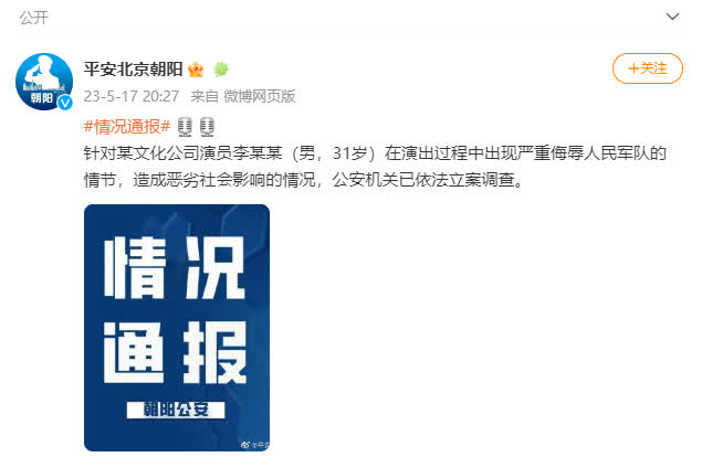 大公文匯網報道,笑果文化脫口秀演員House(李昊石)不當言論一事持續發酵。北京市公安局朝陽分局官方微博@平安北京朝陽 17日晚間發布通報,針對某文化公司演員李某某(男,31歲)在演出過程中出現嚴重侮辱人民軍隊的情節,造成惡劣社會影響的情況,公安機關已依法立案調查。