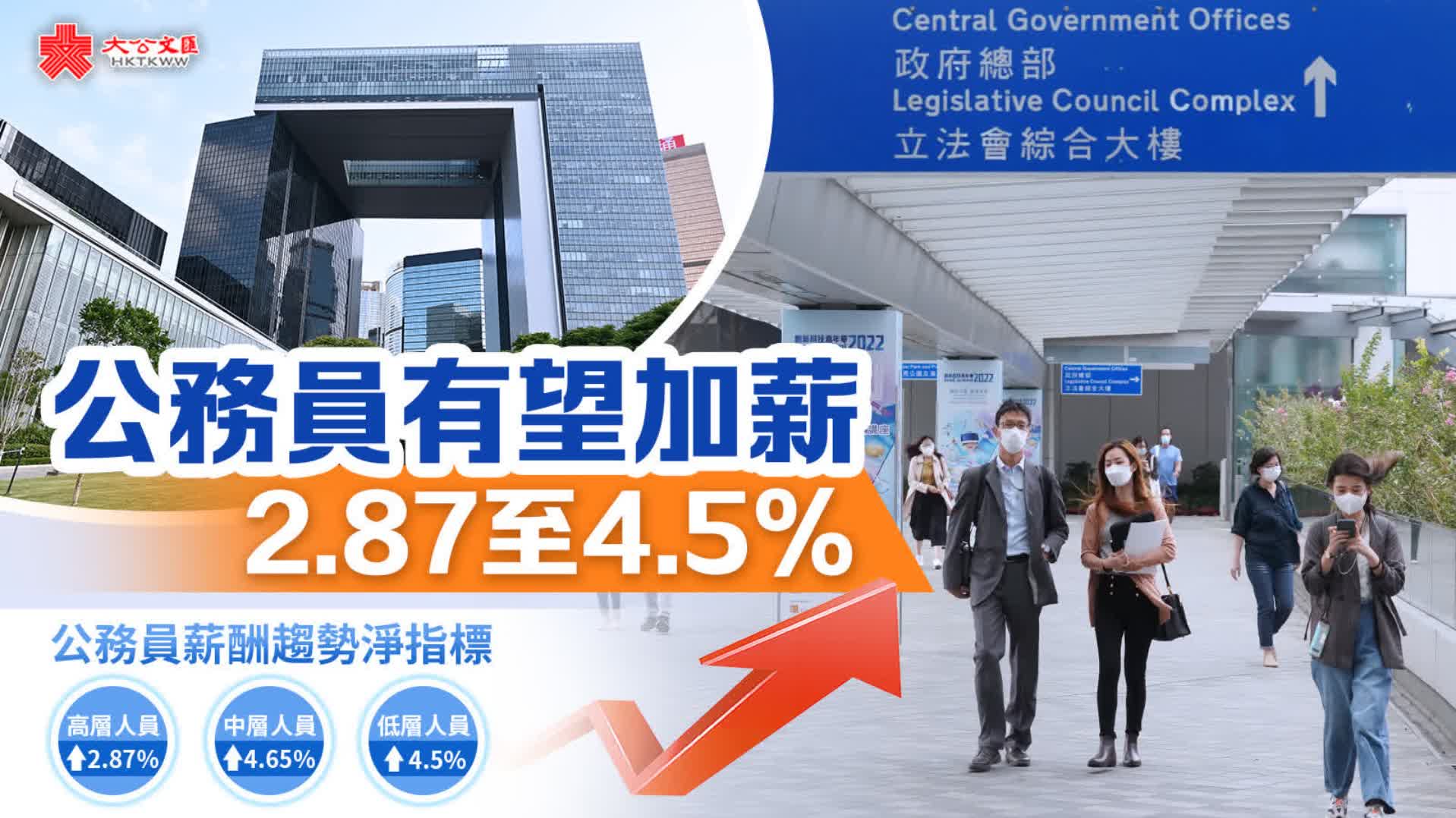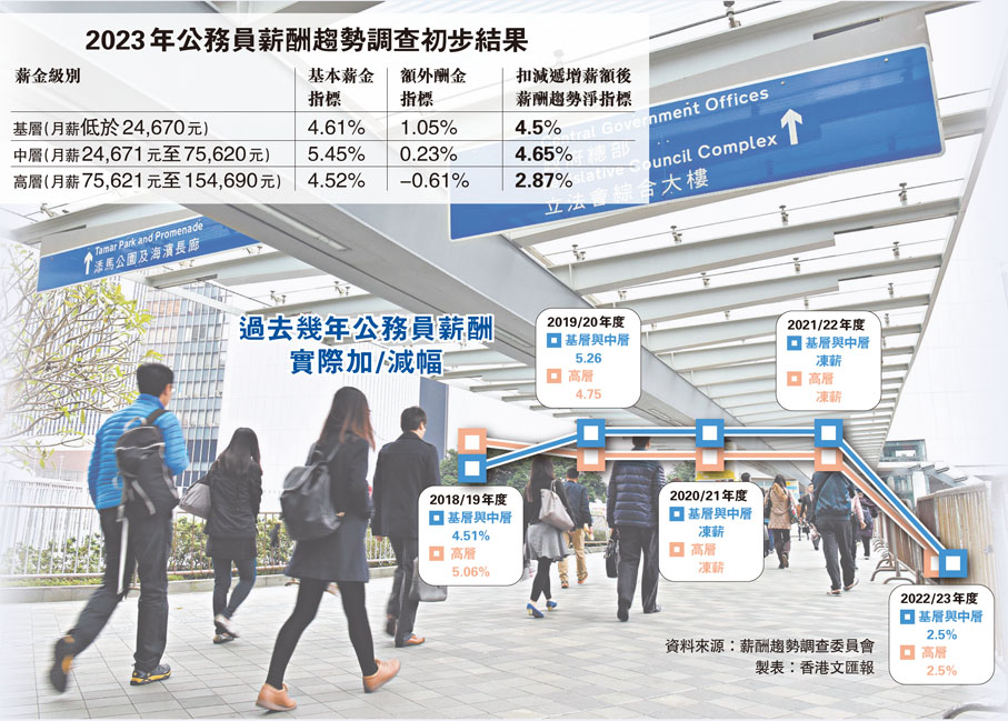 (香港文匯報記者 聶曉輝)影響香港約18萬公務員加薪幅度的薪酬趨勢調查結果昨日出爐。薪酬趨勢調查委員會昨日公布,私營機構的基層、中層、高層員工薪酬趨勢總指標均為正數,分別為5.66%、5.68%及3.91%,在扣除遞增薪額後,基層、中層、高層公務員的薪酬趨勢淨指標分別為4.5%、4.65%及2.87%。公務員事務局表示,已收到調查的初步結果,特區行政長官會同行政會議將按既定的機制決定公務員最終調薪幅度。公務員總工會認同,數據客觀反映調查時的市況,但隨着社會復常,經濟好轉,整體人力市場暢旺,期望政府「拍板」的薪酬加幅更具競爭力,以挽留人才。