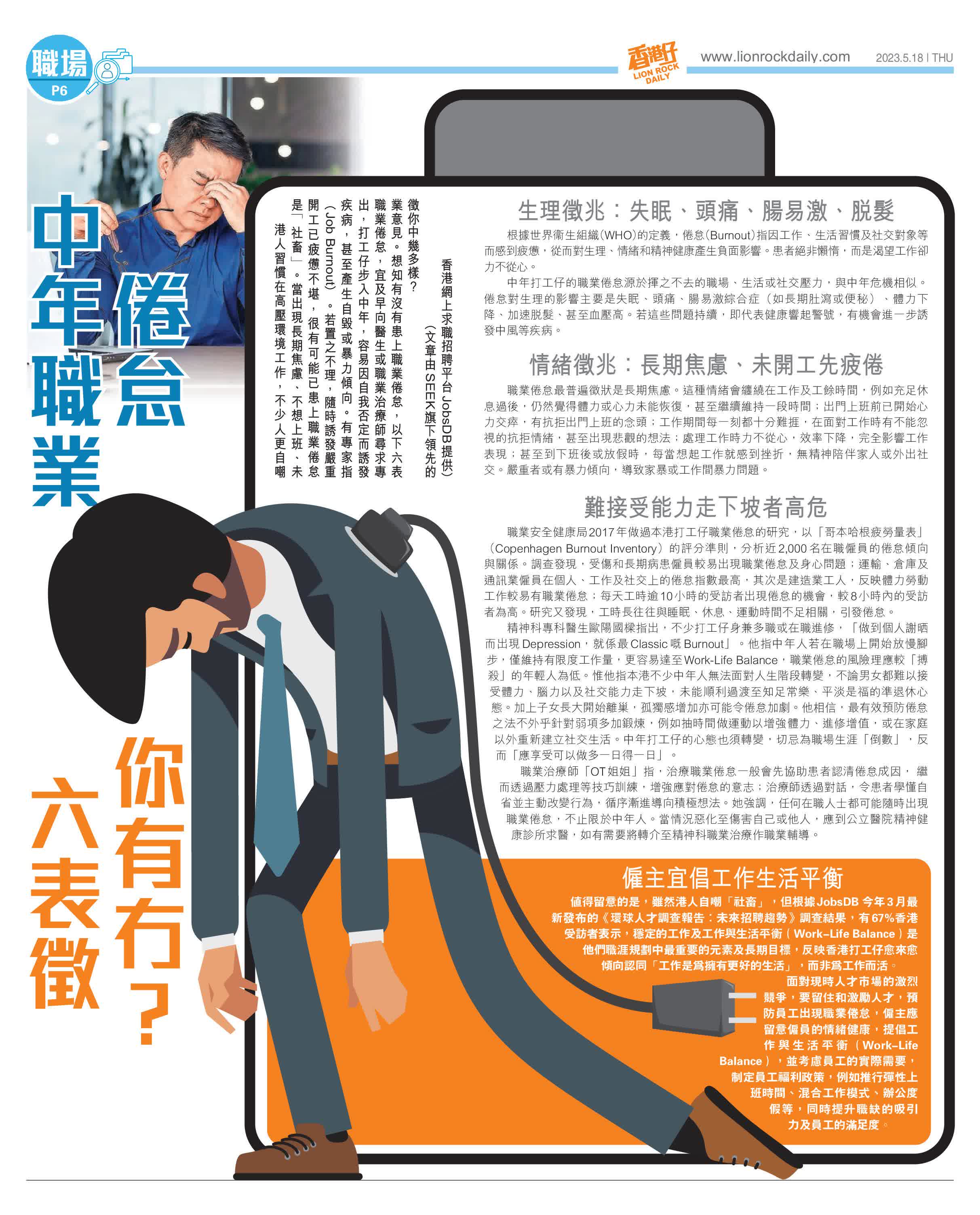 中年打工仔的職業倦怠源於揮之不去的職場、生活或社交壓力,與中年危機相似。倦怠對生理的影響主要是失眠、頭痛、腸易激綜合症(如長期肚瀉或便秘)、體力下降、加速脫髮、甚至血壓高。若這些問題持續,即代表健康響起警號,有機會進一步誘發中風等疾病。