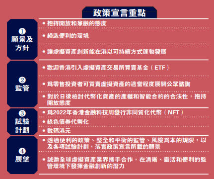 政策宣言明確指,香港作為國際金融中心,對全球從事虛擬資產業務的創新人員抱持開放和兼融的態度,並正與金融監管機構締造便利的環境,以促進香港虛擬資產行業得以可持續和負責任地發展。