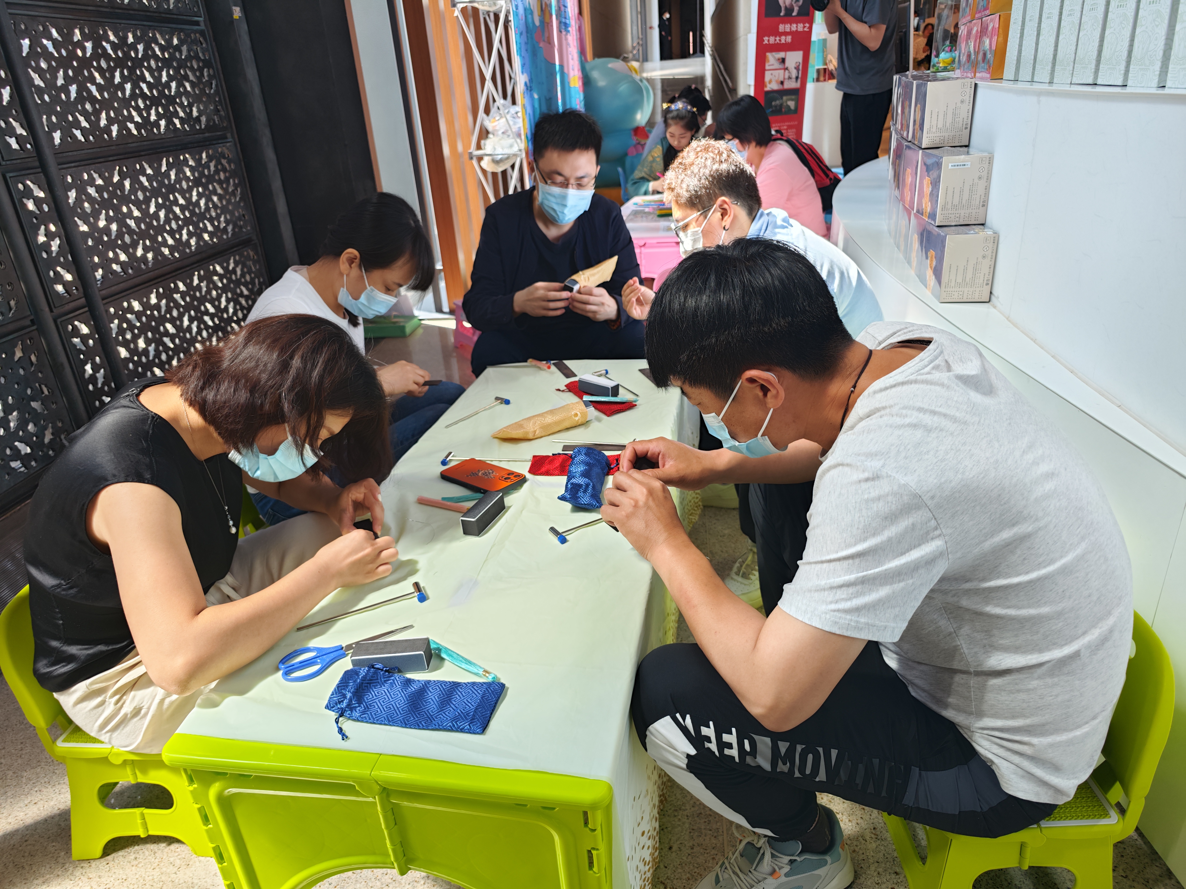 體驗活動以國博館藏文物為核心,以藝術創繪為呈現形式,將展櫃中的文物通過文化創意產品「帶到」文創體驗區。來到博物館參觀的大朋友、小朋友們,通過動手參與創作,如在可水洗布料上進行紋樣塗鴉、為犀尊塗色、「犀尊弄影」皮影塗色、動手製作嵌絲旋紋黑檀木書籤等,與文物展開特別的互動,以此走近國博館藏文物。其中,可水洗布料現場塗鴉的成果可由工作人員完成圖片轉化,現場製作成衣服、馬克杯、手機殼。